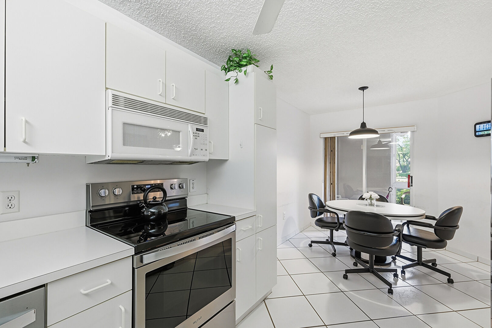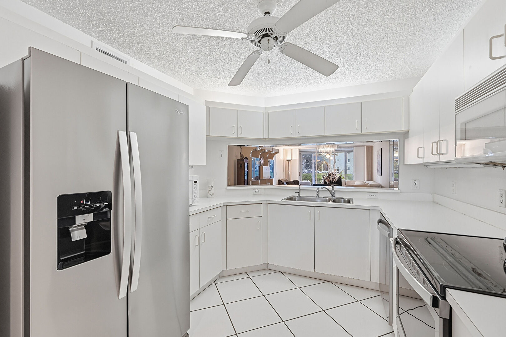 Ceiling Fan, Drywall, Natural Light, Pass Through Window, Pendant Lighting, Textured Ceiling, Tile Floor, Drywall, Tile Floor