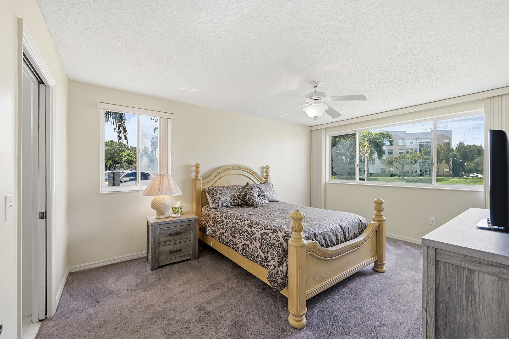 Baseboards Wall, Carpet, Ceiling Fan, Drywall, Natural Light, Tile Floor, Textured Ceiling