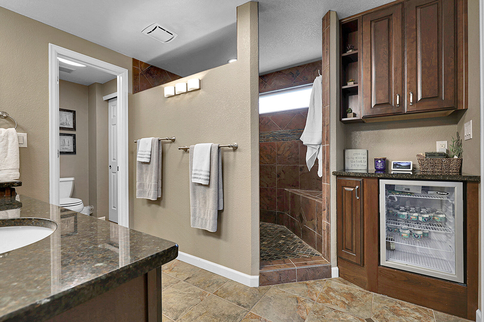 This five bedroom, five bath stylish home features an open vaulted grand entry, formal living room, dining room and office with french doors. Open remodeled kitchen has a large island with double sided storage, high end quartz countertops, premium stainless-steel appliances, and cherrywood cabinets. Tile backsplash with under-cabinet lighting and a large picture window over the farm sink. Separate eating space with bay windows.