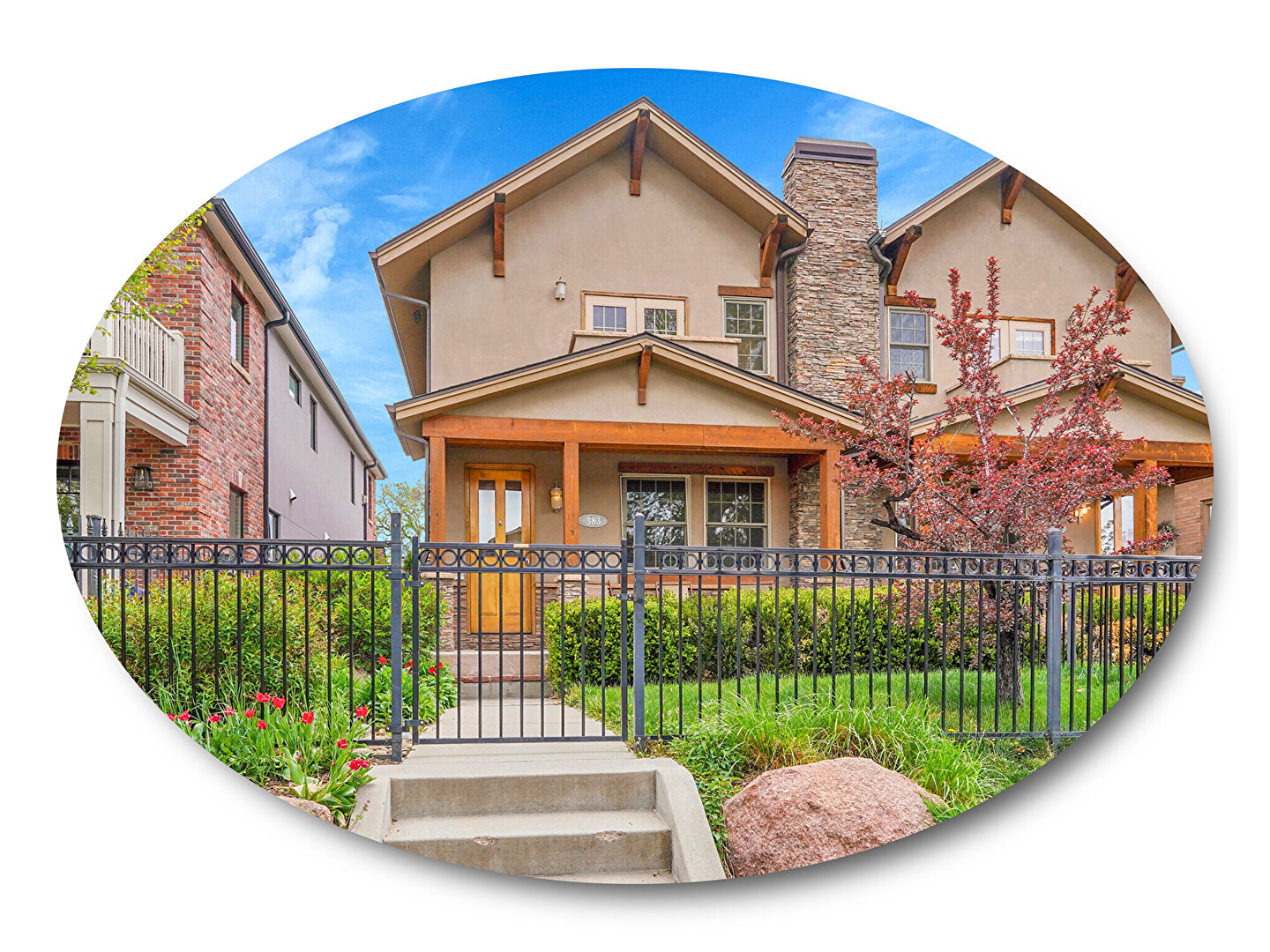 With Wash Park just steps away, this Lake View Fitzgeralds duplex offers a rare opportunity for luxurious living in a serene, tree-lined setting! Take in the morning sun and greet neighbors from your perch on the wooden beam-accented front porch. Greeted by a foyer with black slate tile and a modern chandelier, rich hardwood floors and crisp white walls create a gallery-like ambiance that flows throughout. A light-filled office, framed by double French doors, invites focus with custom built-ins and views of the front porch, with a nearby half bath. Designed with connection in mind, the open-concept kitchen, dining, and living areas flow effortlessly to the connected backyard through French doors. The formal dining room shines with elegant pendant lighting, built-ins with glass-front cabinets, and abundant natural light. The kitchen features rich wood cabinetry, granite counters, stainless steel appliances, and a five-burner island cooktop, while the living room is warmed by a stone-clad corner fireplace and wooden mantel. Upstairs, the sun-filled primary suite boasts vaulted ceilings and a spa-like ensuite bath with double sinks, a standing glass shower with slate tile, and a corner soaking tub. Two additional bedrooms—one with a walk-in closet and access to a private balcony—offer plenty of space, while a convenient laundry room streamlines daily tasks. The finished basement includes a large rec room with natural light from egress windows, a small kitchen, spacious bedroom, and full bath—perfect for hosting. Step outside to an entertainer’s dream backyard with a raised mosaic slate stone area, lush landscaping, an outdoor kitchen with a 4-burner grill and cozy stone fireplace—plus a detached garage for added convenience. Enjoy the best of the city with Wash Park, Gaylord Street, and Cherry Creek just minutes away. This home is a polished gem in the heart of the Mile High City.