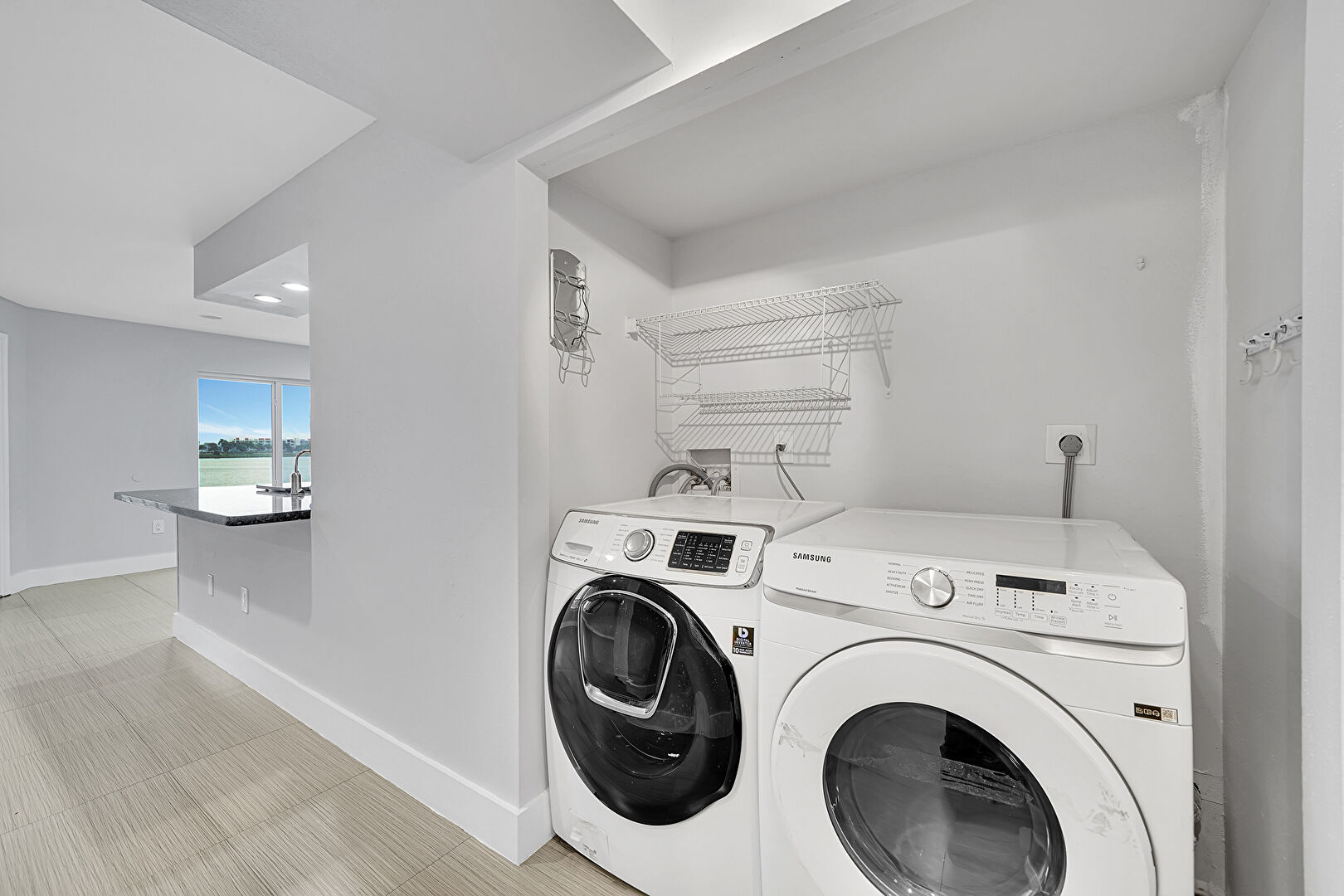 Baseboards Wall, Drywall, Natural Light, Recessed Lighting, Vinyl Floor, Washer Dryer, Water View, Drywall, Laundry, Vent