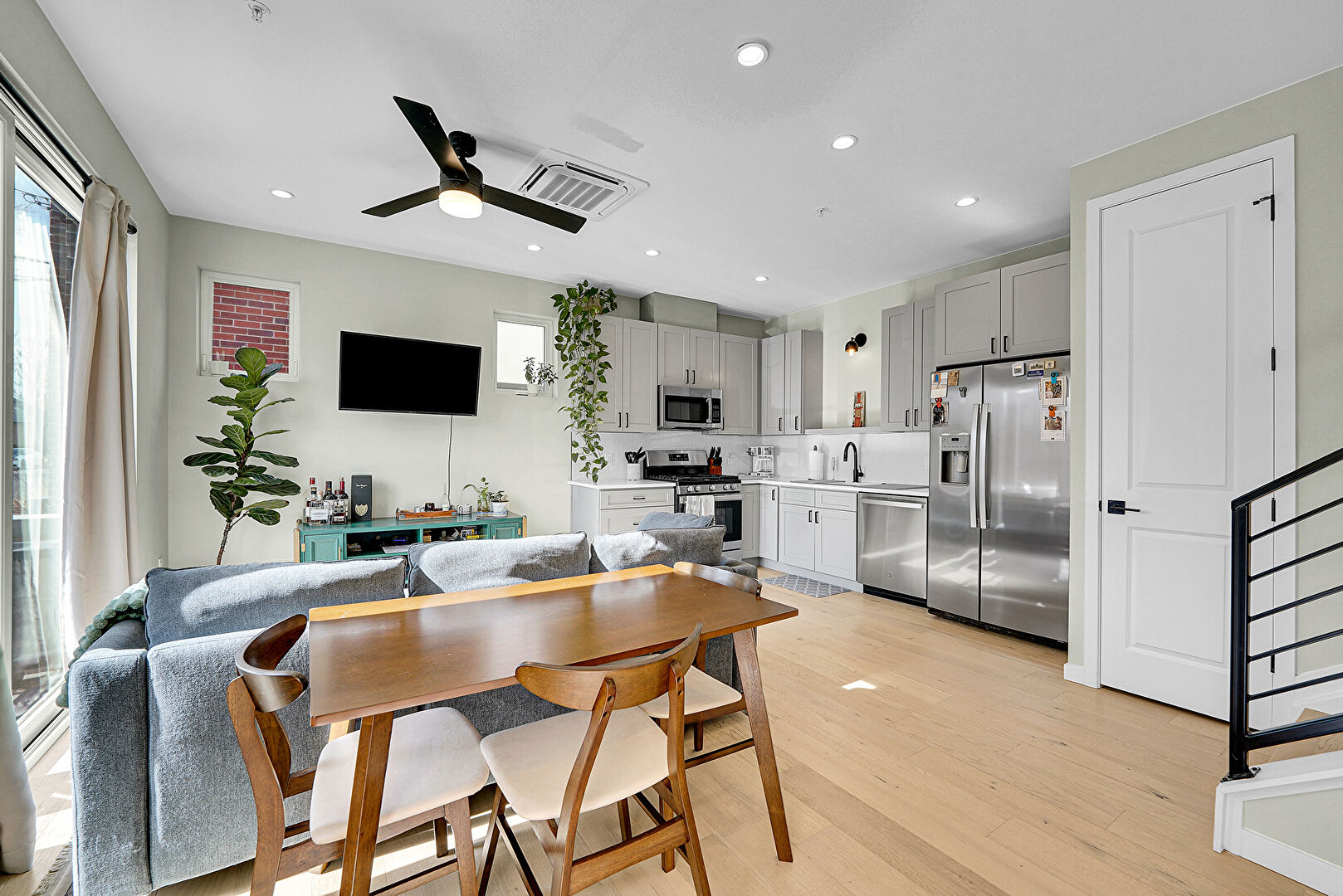 Ceiling Fan, Drywall, L Shaped Kitchen, Natural Light, Pendent Fire Sprinkler, Recessed Lighting, Stairs, Vent, Wood Finish Floor, Ceiling Fan, Drywall
