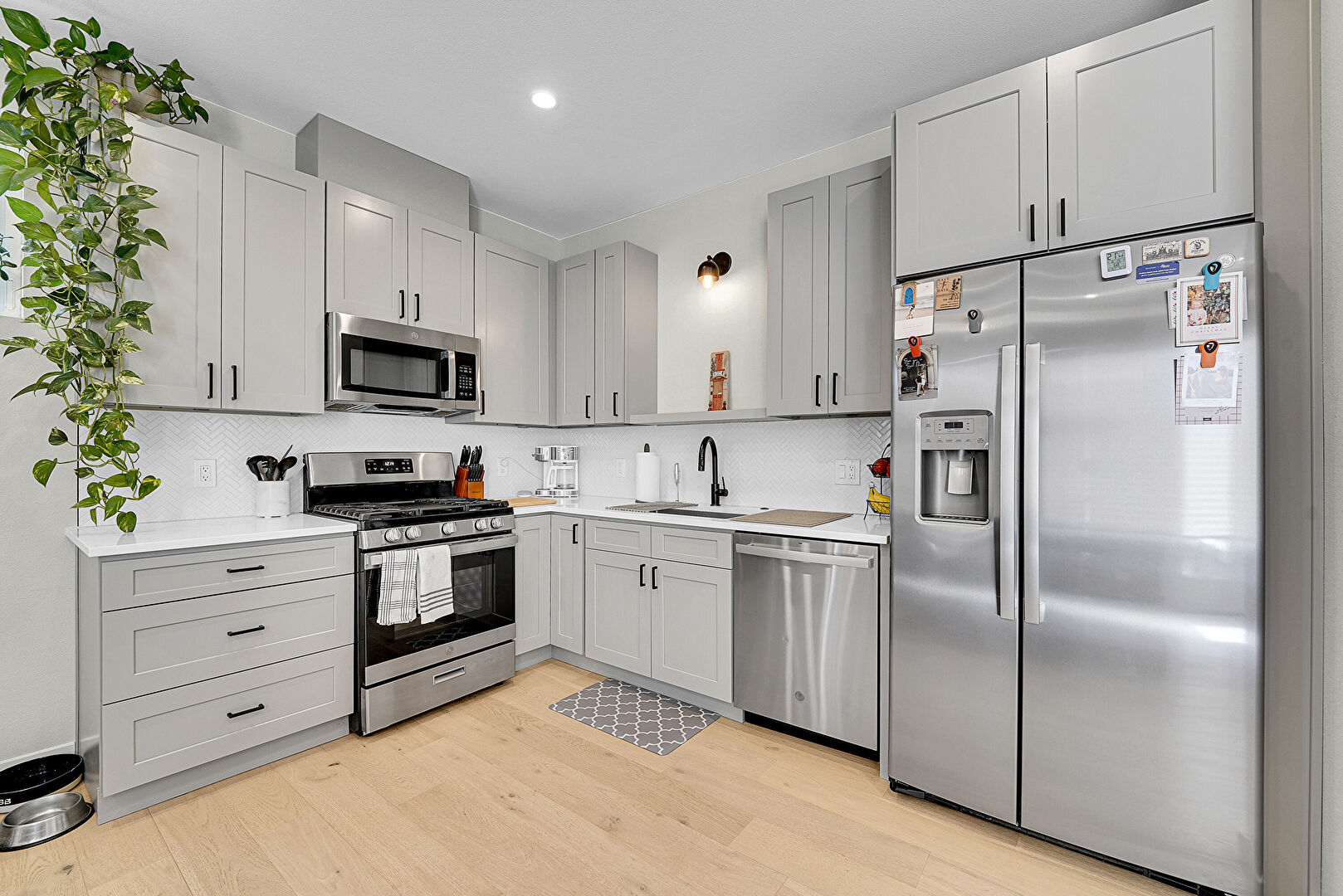 Baseboards Wall, Drywall, Gray Cabinets, L Shaped Kitchen, Recessed Lighting, Shaker Cabinets, Vaulted Ceiling, Wood Finish Floor, Drywall, Shaker Cabinets, Wood Finish Floor
