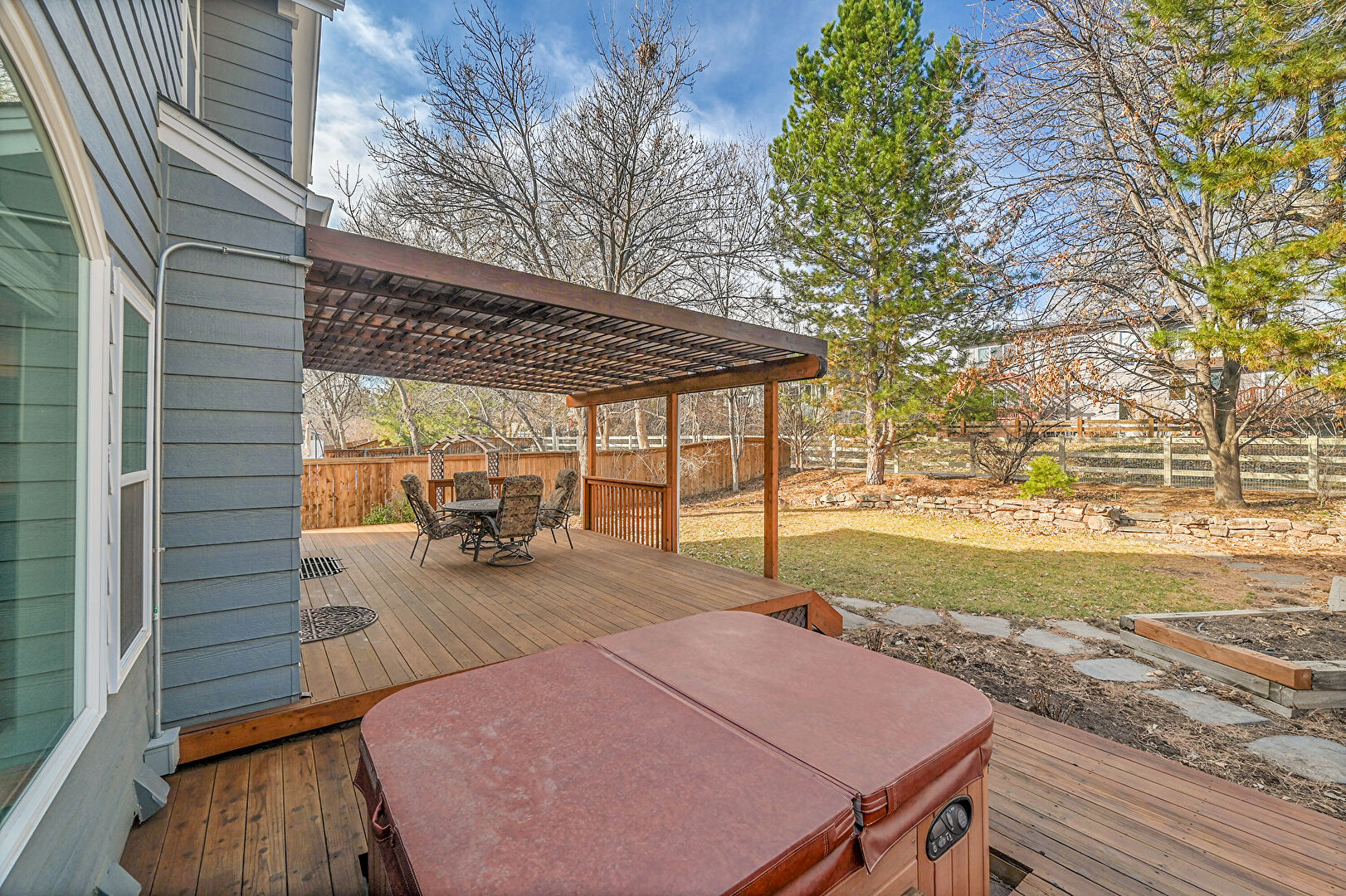 Deck, Fence, Grill, Hot Tub, Lawn, Outdoor Dining Area, Pergola, Deck, Fence, Outdoor Dining Area, Pergola