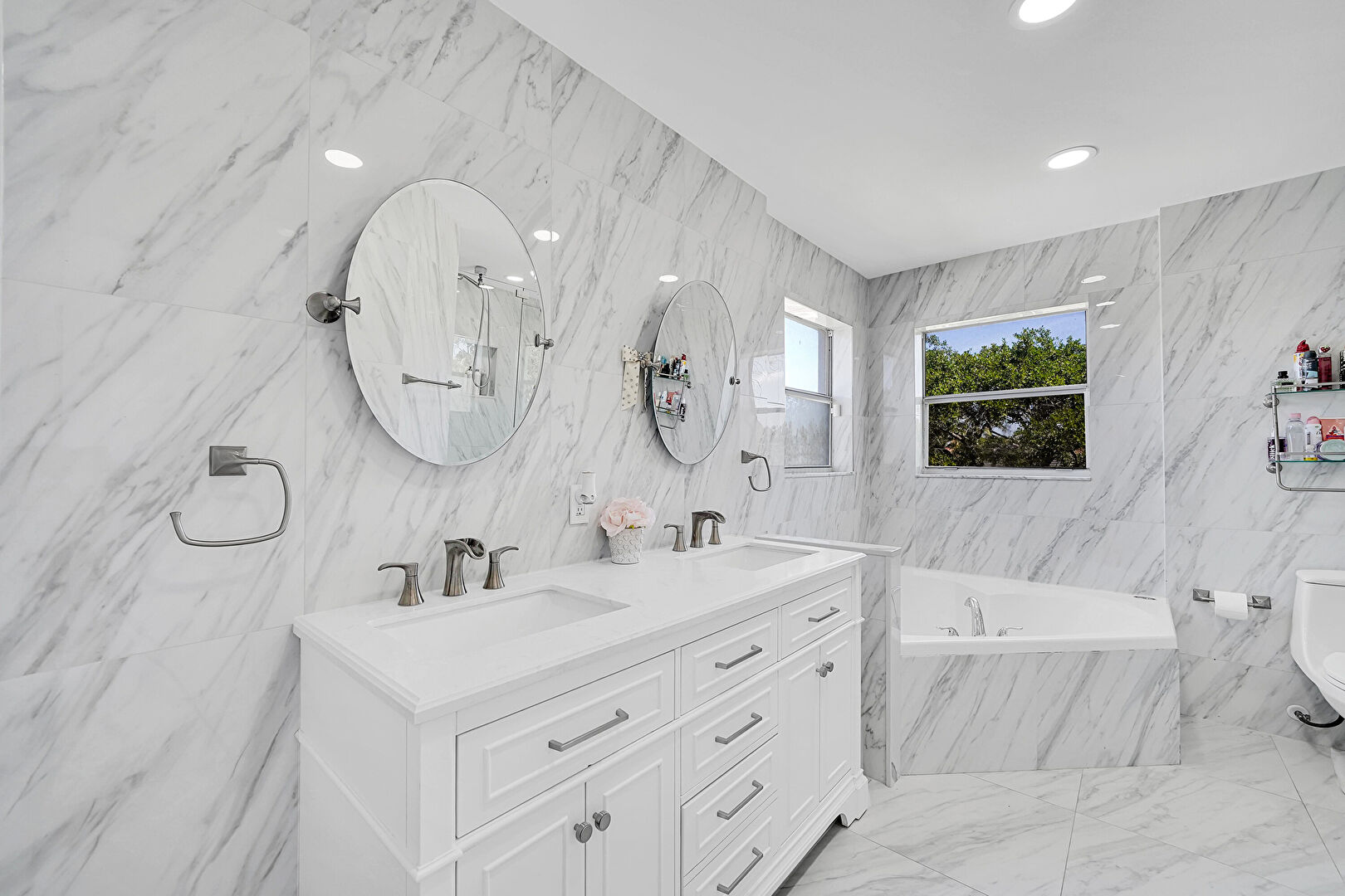 Double Vanity, Full Bathroom, Marble Finish Floor, Natural Light, Recessed Lighting, Tile Wall, Full Bathroom, Tile Wall, Vanity