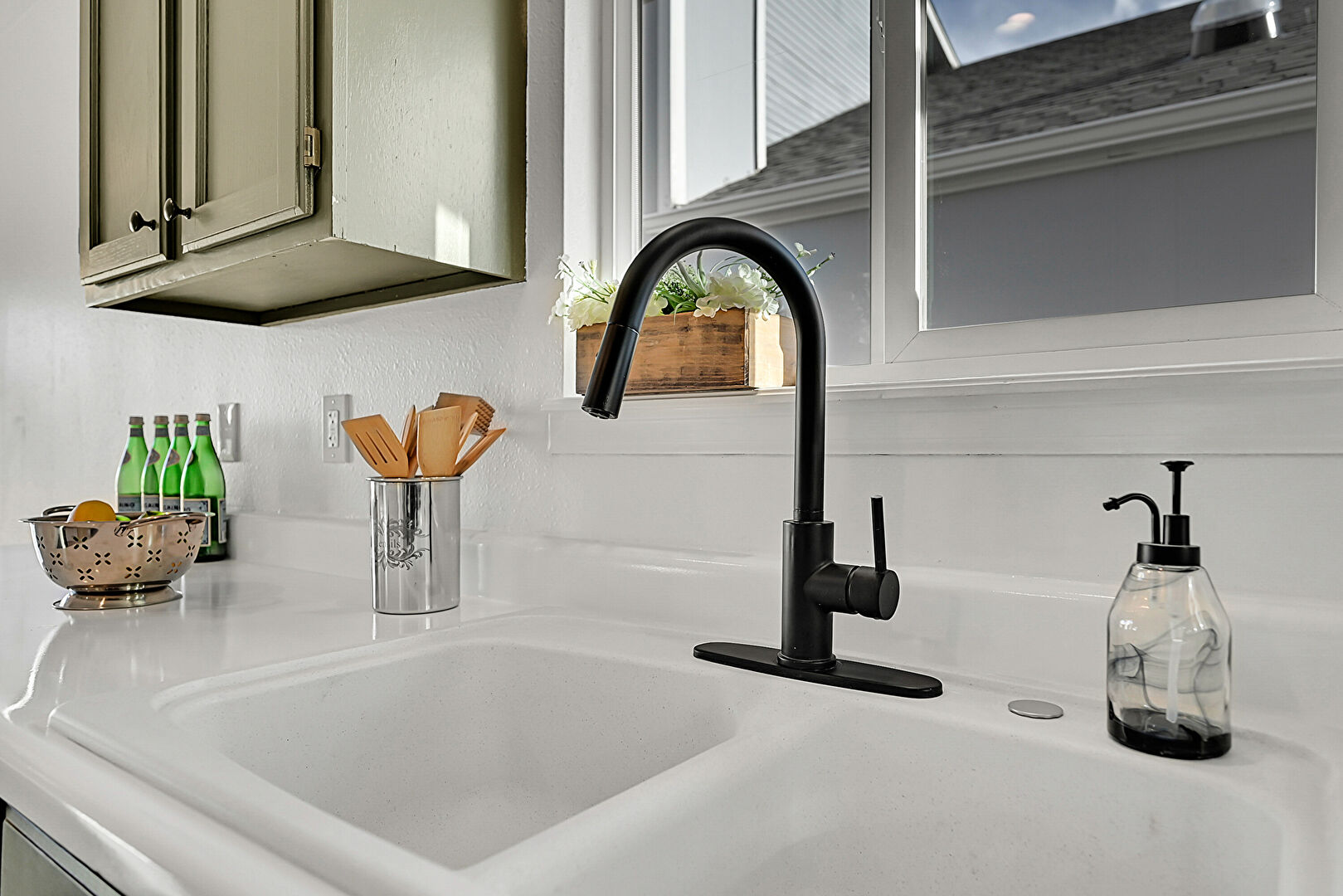 Arched Cabinets, Baseboards Wall, Drywall, Green Cabinets, Kitchen Peninsula, Natural Light, Notable Chandelier, Pendant Lighting, Recessed Lighting, Shaker Cabinets, U Shaped Kitchen, Vent, Visible Hinge Cabinets, Wood Finish Floor, Arched Cabinets, Gray Cabinets, Natural Light, Pendant Lighting, Visible Hinge Cabinets