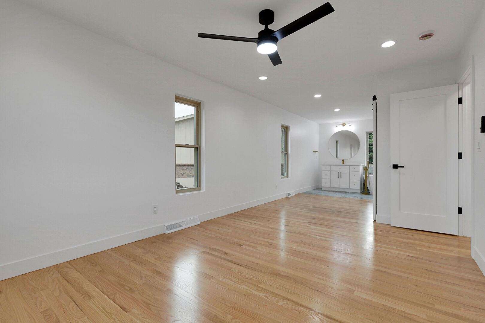 Barn Door, Baseboards Wall, Ceiling Fan, Drywall, Natural Light, Recessed Lighting, Vent, Wood Finish Floor, Barn Door, Baseboards Wall, Natural Light, Wood Finish Floor