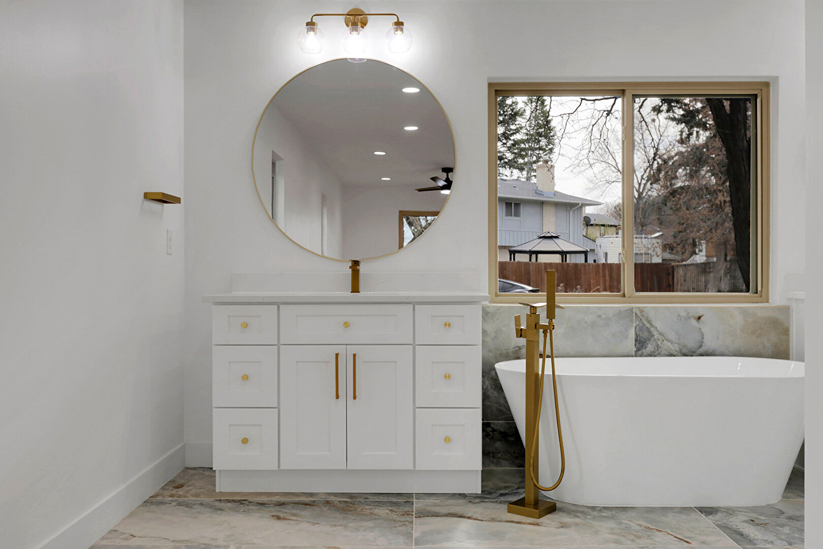 Accent Wall, Baseboards Wall, Ceiling Fan, Drywall, Full Bathroom, Marble Finish Floor, Natural Light, Recessed Lighting, Two Single Vanities, Vanity, Drywall, Full Bathroom, Recessed Lighting, Tile Wall