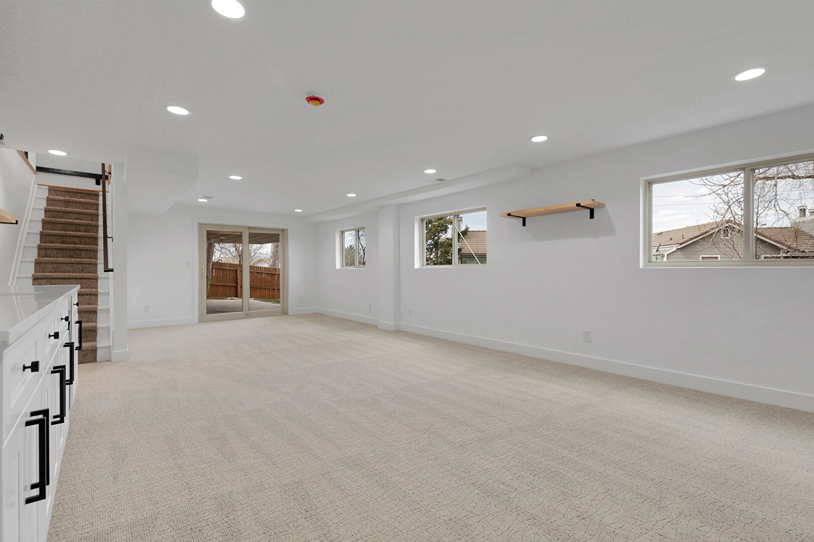Baseboards Wall, Carpet, Drywall, Indoor Bar, Natural Light, Recessed Lighting, Stairs, Vent, Wine Cooler, Baseboards Wall, Drywall, Natural Light, Recessed Lighting, Wine Cooler