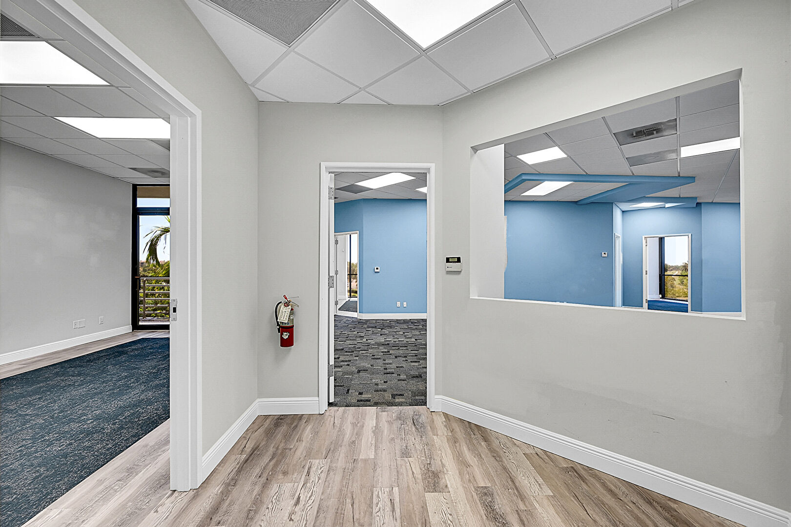 Baseboards Wall, Drop Ceiling, Drywall, Fire Extinguisher, Natural Light, Vent, Wood Finish Floor, Carpet, Drop Ceiling, Vent