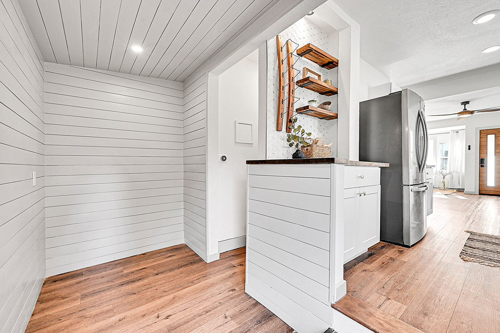 Barn Door, Baseboards Wall, Carpet, Ceiling Fan, Drywall, Fence, Horizontal Siding, Natural Light, Stoop, Stucco Siding, Vent, Wood Wall, Ceiling Fan, Natural Light, Shingle Roof