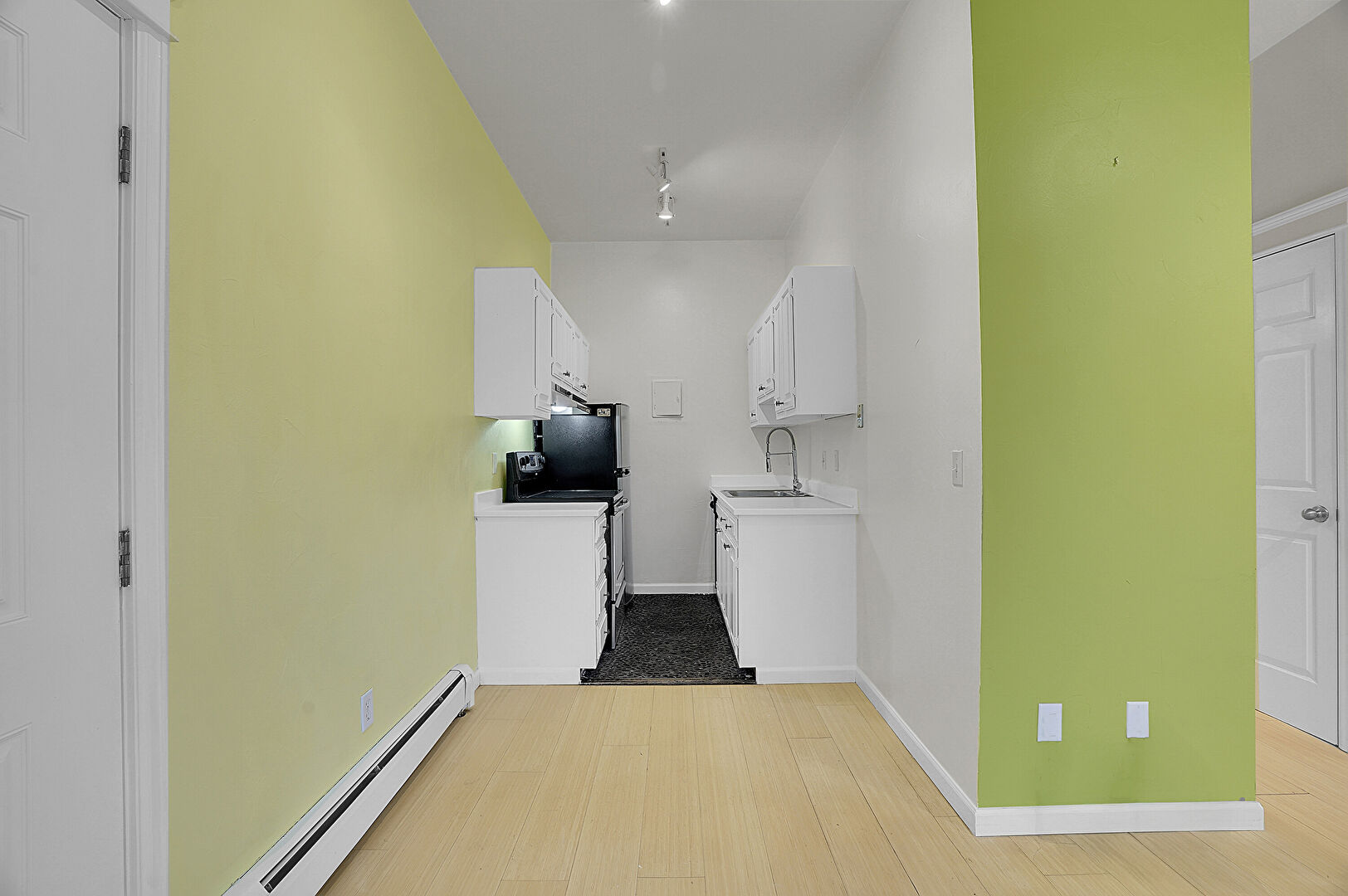 Baseboard Radiator, Baseboards Wall, Drywall, Galley Kitchen, Natural Light, Shaker Cabinets, Track Lighting, Wood Finish Floor, Drywall, Fireplace, Wood Finish Floor