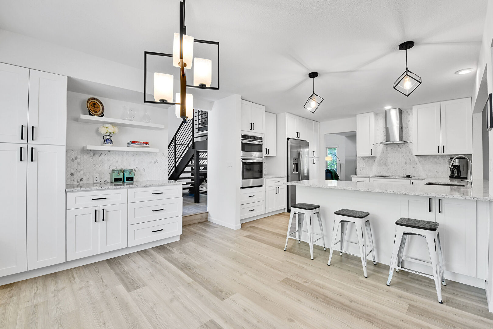Baseboards Wall, Double Oven, Drywall, Fireplace, G Shaped Kitchen, Kitchen Bar, Kitchen Peninsula, Natural Light, Open Shelves, Pendant Lighting, Recessed Lighting, Shaker Cabinets, Stairs, Stone Countertops, Textured Ceiling, Vent, Wood Finish Floor, Double Oven, Drywall, Fireplace, Shaker Cabinets, Stone Countertops