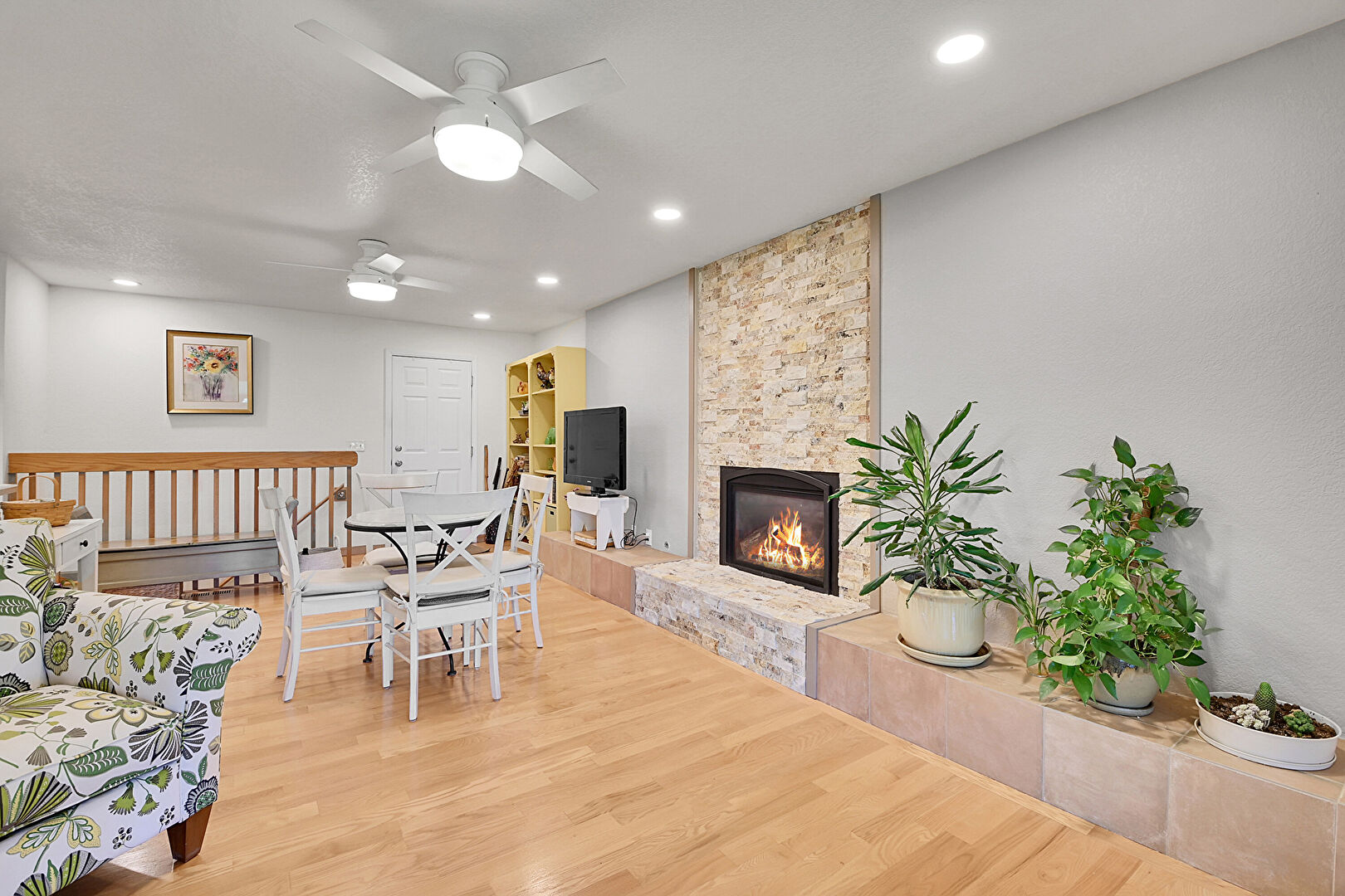 Baseboards Wall, Ceiling Fan, Drywall, Fireplace, G Shaped Kitchen, Natural Light, Recessed Lighting, Skylight, Textured Ceiling, Vent, Wood Finish Floor, Baseboards Wall, Ceiling Fan, Natural Light, Recessed Lighting, Wood Finish Floor