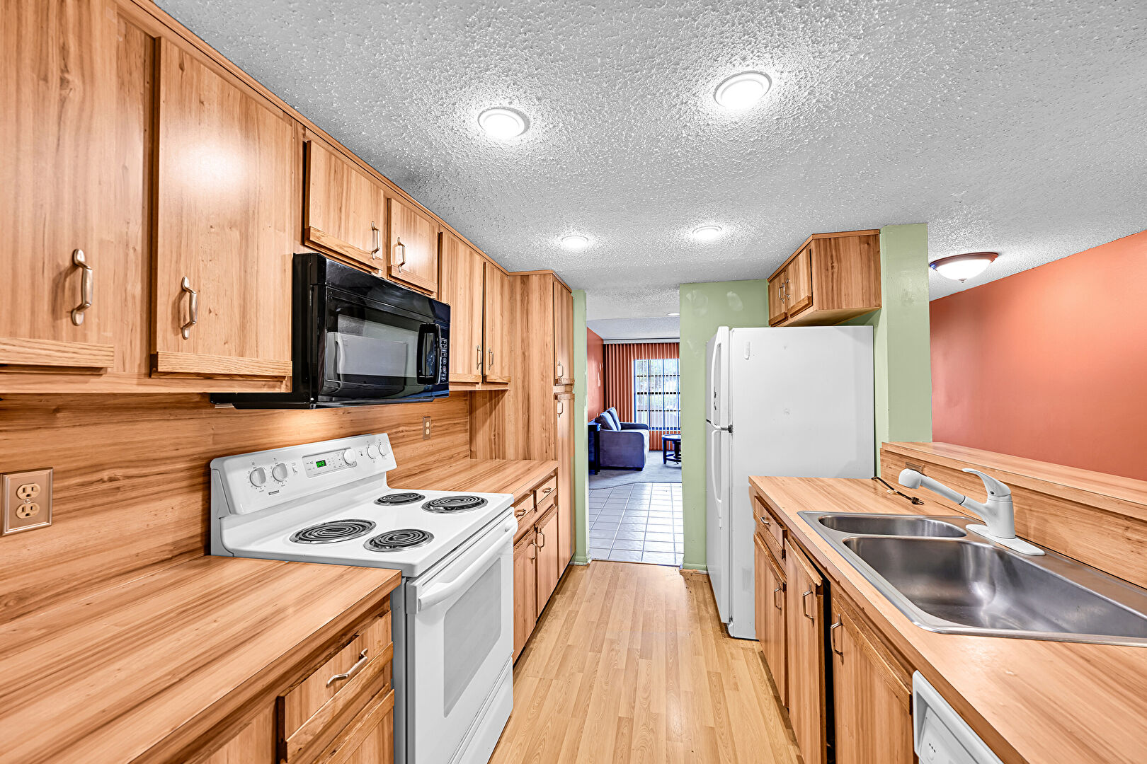 Baseboards Wall, Butcher Block Countertops, Ceiling Fan, Drywall, Kitchen Peninsula, Natural Light, Pass Through Window, Recessed Lighting, Textured Ceiling, Vent, Wood Finish Floor, Recessed Lighting, Vent, Wood Finish Floor