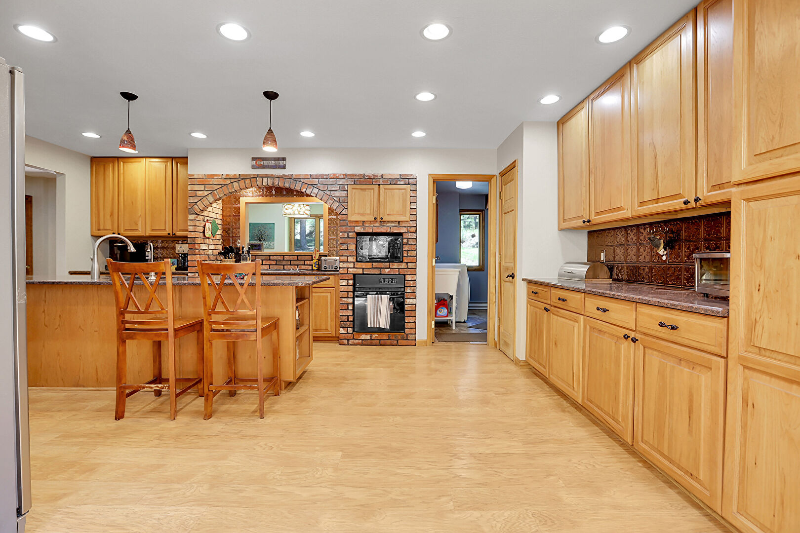 Arched Walkways, Drywall, Kitchen Bar, Kitchen Island, Kitchen Peninsula, Medium Brown Cabinets, Natural Light, Open Shelves, Pass Through Window, Pendant Lighting, Raised Cabinets, Recessed Lighting, Stone Countertops, Toaster, Vent, Vinyl Floor, Wood Finish Floor, Arched Walkways, Baseboards Wall, Natural Light, Raised Cabinets, Stone Countertops, Wood Finish Floor