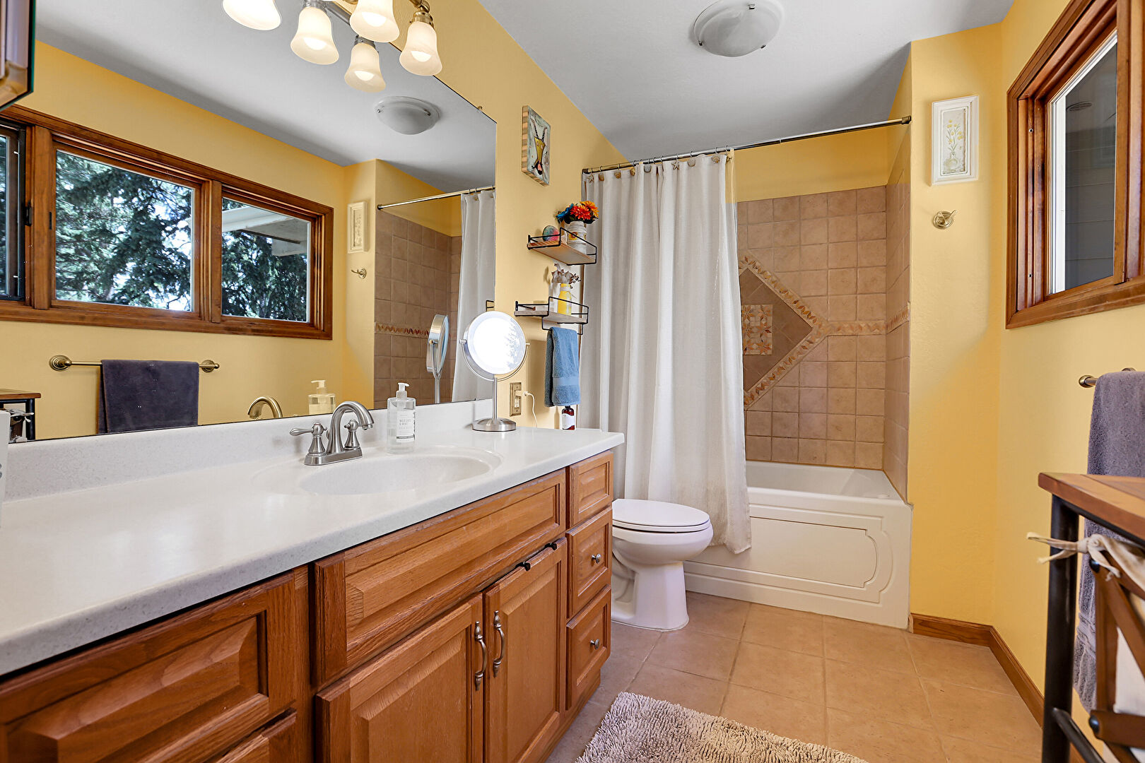 Combined Bath Shower, Double Vanity, Drywall, Full Bathroom, Natural Light, Notable Chandelier, Tile Floor, Vanity, Vent, Baseboards Wall, Combined Bath Shower, Double Vanity, Drywall, Full Bathroom, Vanity