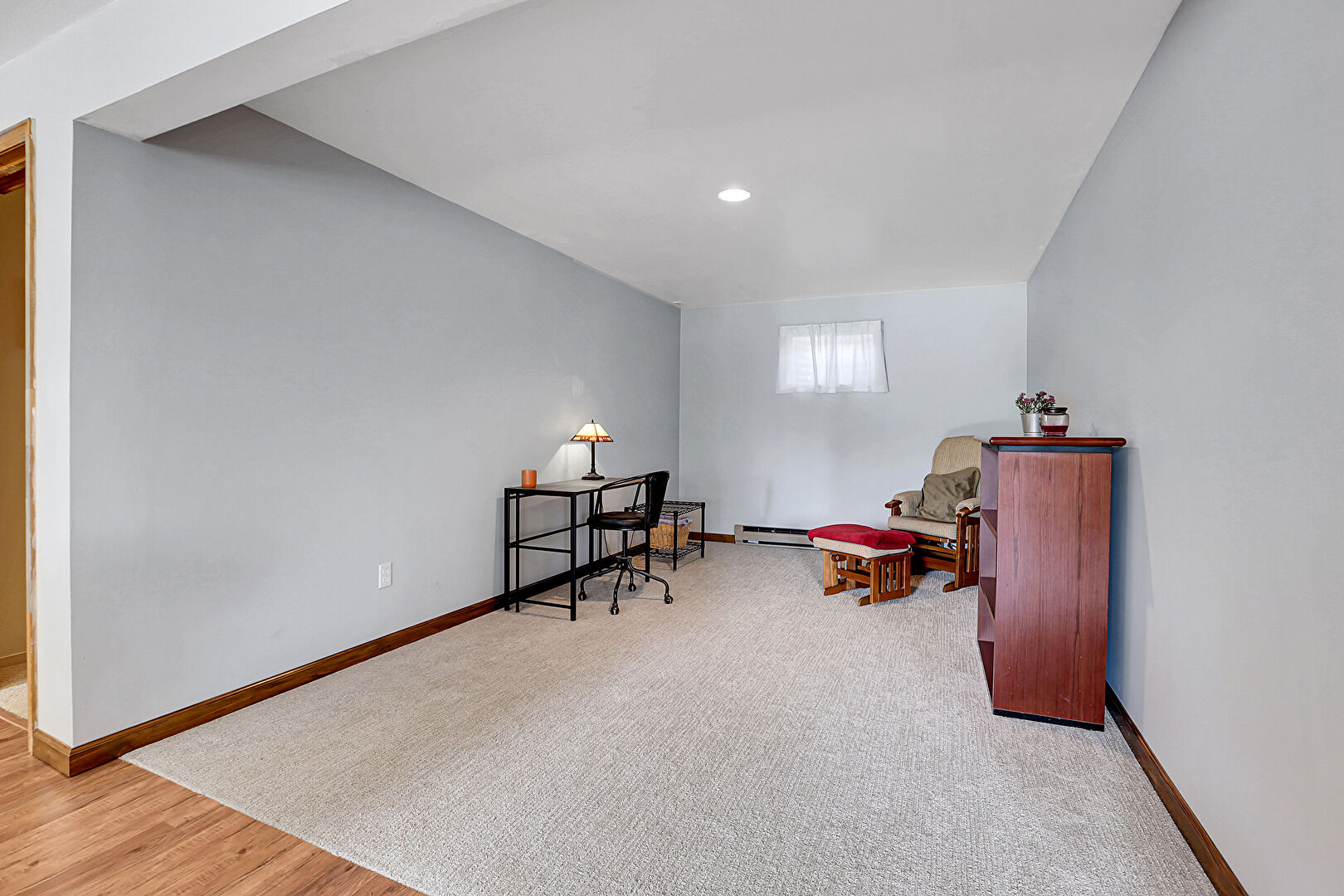 Baseboard Radiator, Baseboards Wall, Carpet, Ceiling Fan, Drywall, Natural Light, Recessed Lighting, Wood Finish Floor, Wood Wall, Baseboard Radiator, Baseboards Wall, Carpet, Office Area, Recessed Lighting