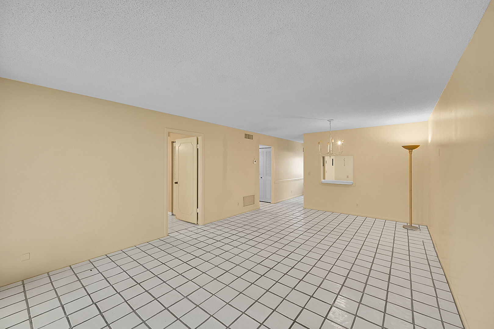Baseboards Wall, Drywall, Notable Chandelier, Textured Ceiling, Vent, Tile Floor