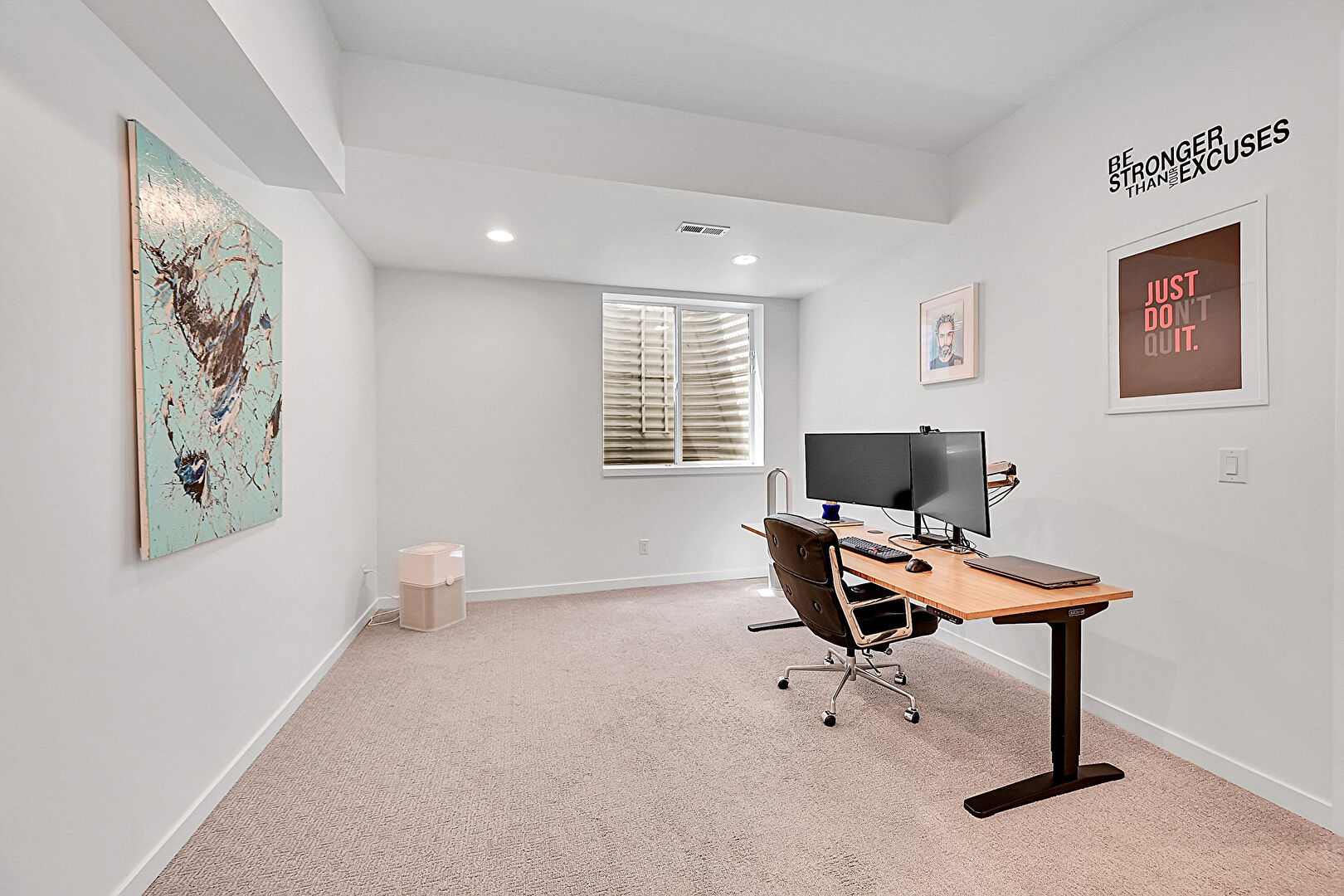 Baseboards Wall, Carpet, Drywall, Natural Light, Office Area, Recessed Lighting, Carpet, Vent