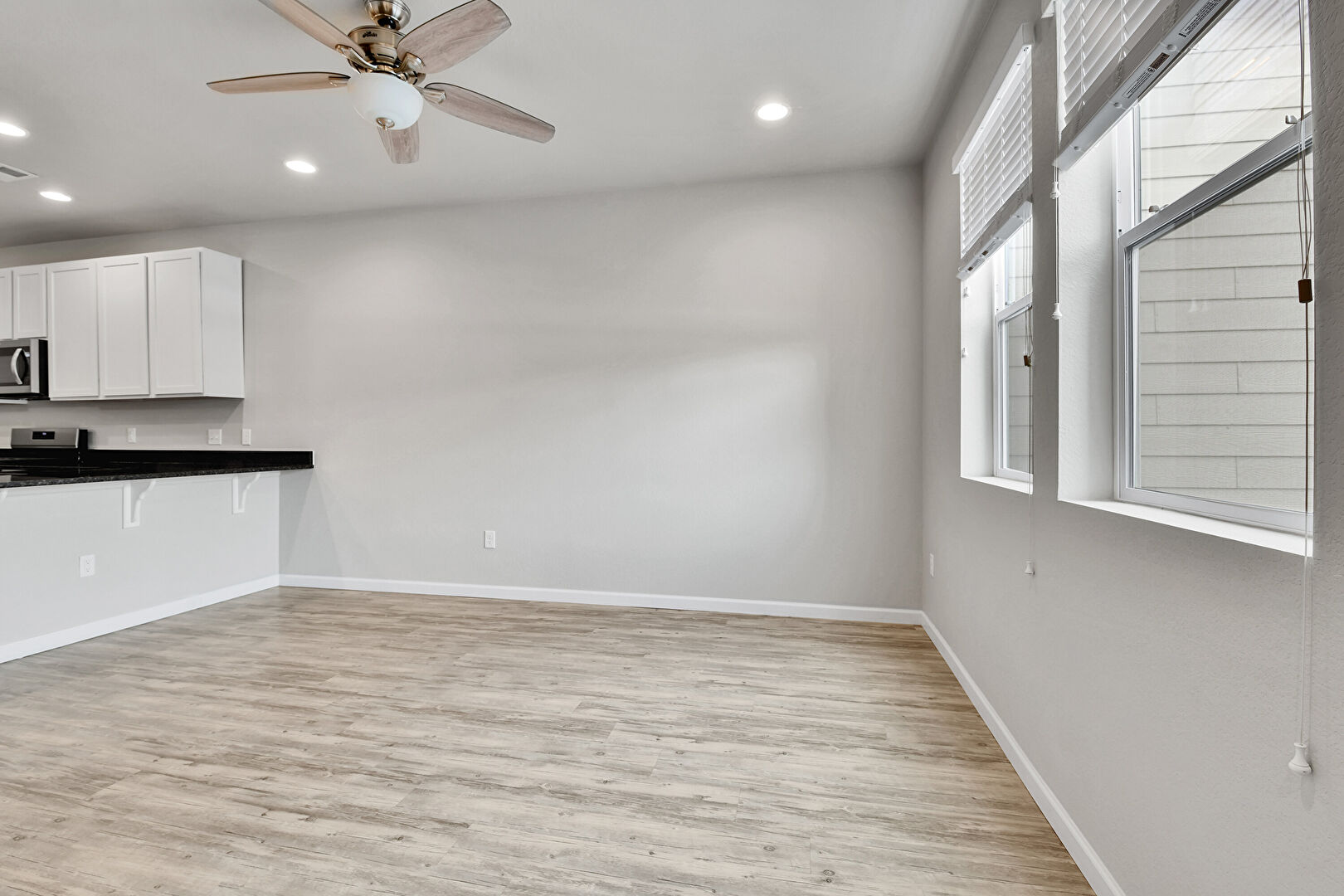 Baseboards Wall, Ceiling Fan, Drywall, Natural Light, Notable Chandelier, Recessed Lighting, Shaker Cabinets, Stairs, Vent, Wood Finish Floor, Baseboards Wall, Kitchen Bar, Recessed Lighting