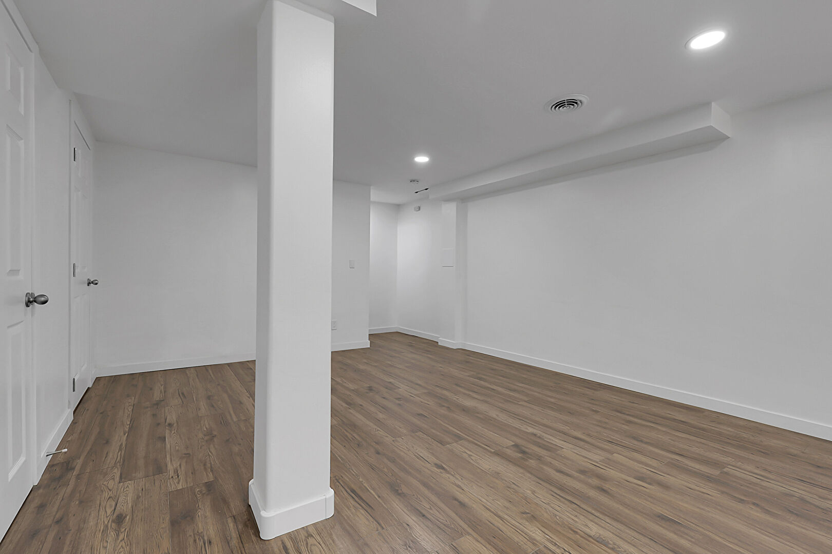 Baseboards Wall, Basement, Drywall, Natural Light, Recessed Lighting, Vent, Wood Finish Floor, Recessed Lighting, Vent