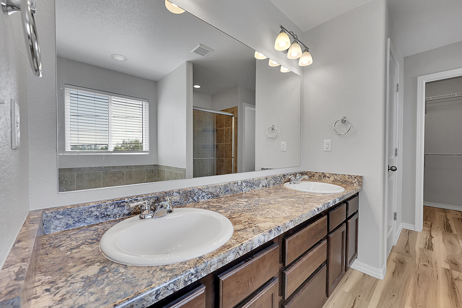 Baseboards Wall, Closet, Double Vanity, Drywall, Full Bathroom, Natural Light, Recessed Lighting, Walk In Closet, Wood Finish Floor, Full Bathroom, Vent, Wood Finish Floor