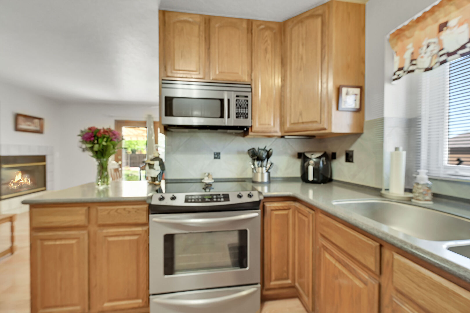 Arched Cabinets, Baseboards Wall, Drywall, Fireplace, Kitchen Peninsula, Laundry, Medium Brown Cabinets, Natural Light, Raised Cabinets, Textured Ceiling, U Shaped Kitchen, Vent, Visible Hinge Cabinets, Wood Finish Floor, Ceiling Fan, Kitchen Peninsula, Medium Brown Cabinets, Raised Cabinets, Textured Ceiling, Wood Finish Floor