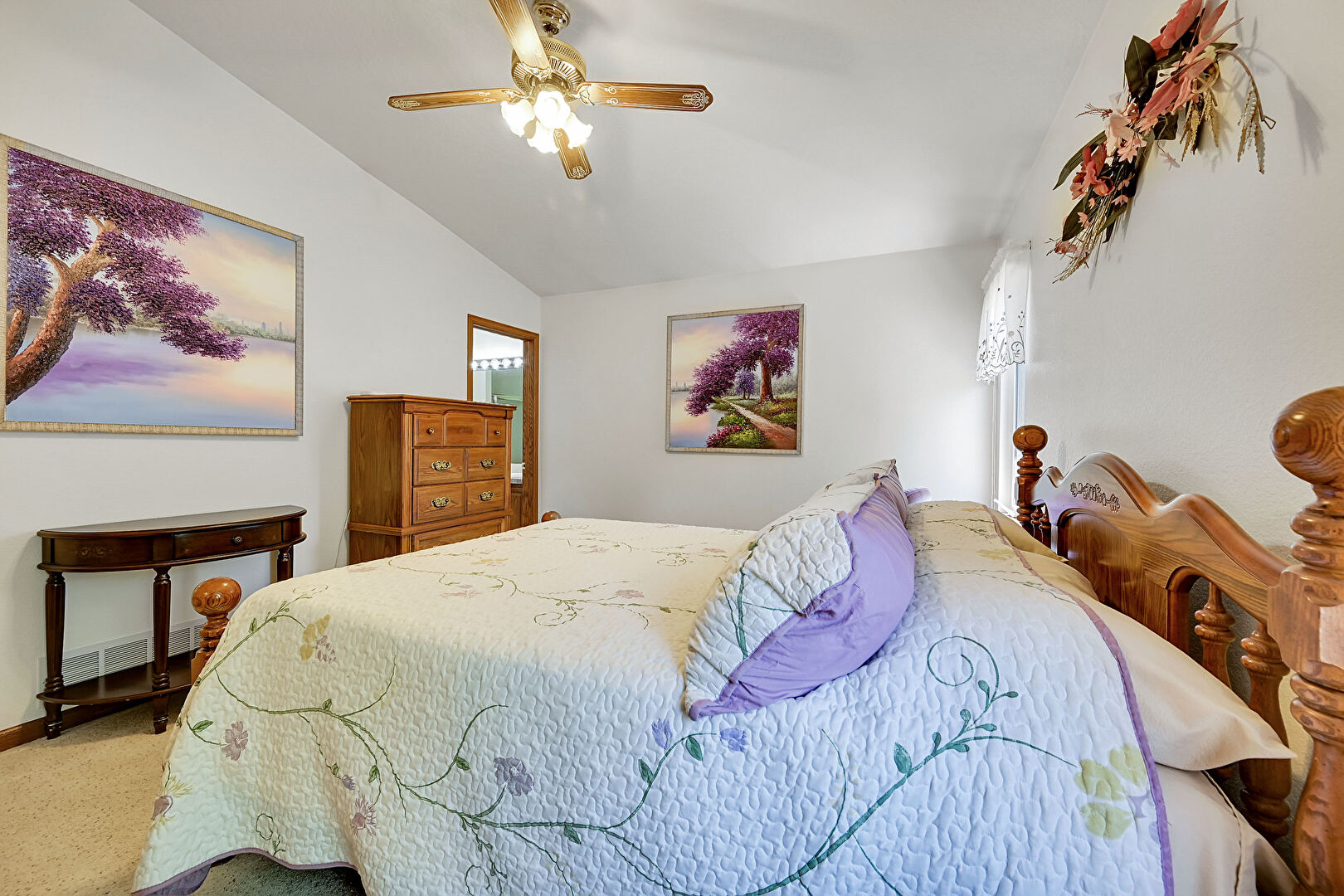 Baseboards Wall, Carpet, Ceiling Fan, Drywall, Ensuite Bathroom, Natural Light, Vaulted Ceiling, Vent, Carpet, Ceiling Fan, Ensuite Bathroom, Natural Light