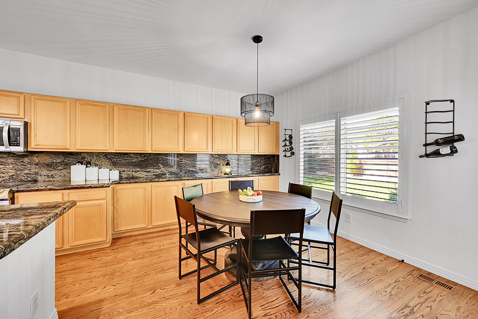 Baseboards Wall, Built In Shelves, Drywall, Kitchen Bar, Kitchen Island, Laundry, Natural Light, Opens To Living Area, Pendant Lighting, Recessed Lighting, Shaker Cabinets, Stone Countertops, Vent, Wood Finish Floor, Ceiling Fan, Kitchen Bar, Kitchen Island, Natural Light, Stone Finish Floor