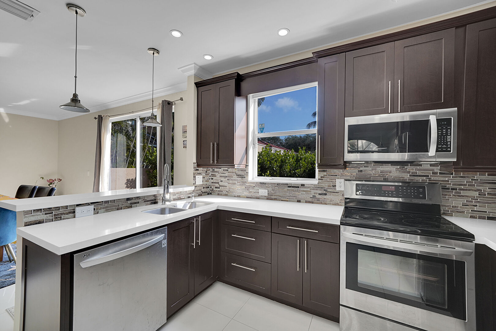 Baseboards Wall, Crown Molding, Crown Molding Cabinets, Dark Brown Cabinets, Drywall, G Shaped Kitchen, Kitchen Bar, Kitchen Peninsula, Natural Light, Opens To Living Area, Pendant Lighting, Recessed Lighting, Shaker Cabinets, Tile Floor, U Shaped Kitchen, Vent, Crown Molding Cabinets, Kitchen Bar, Natural Light, Pendant Lighting, Shaker Cabinets