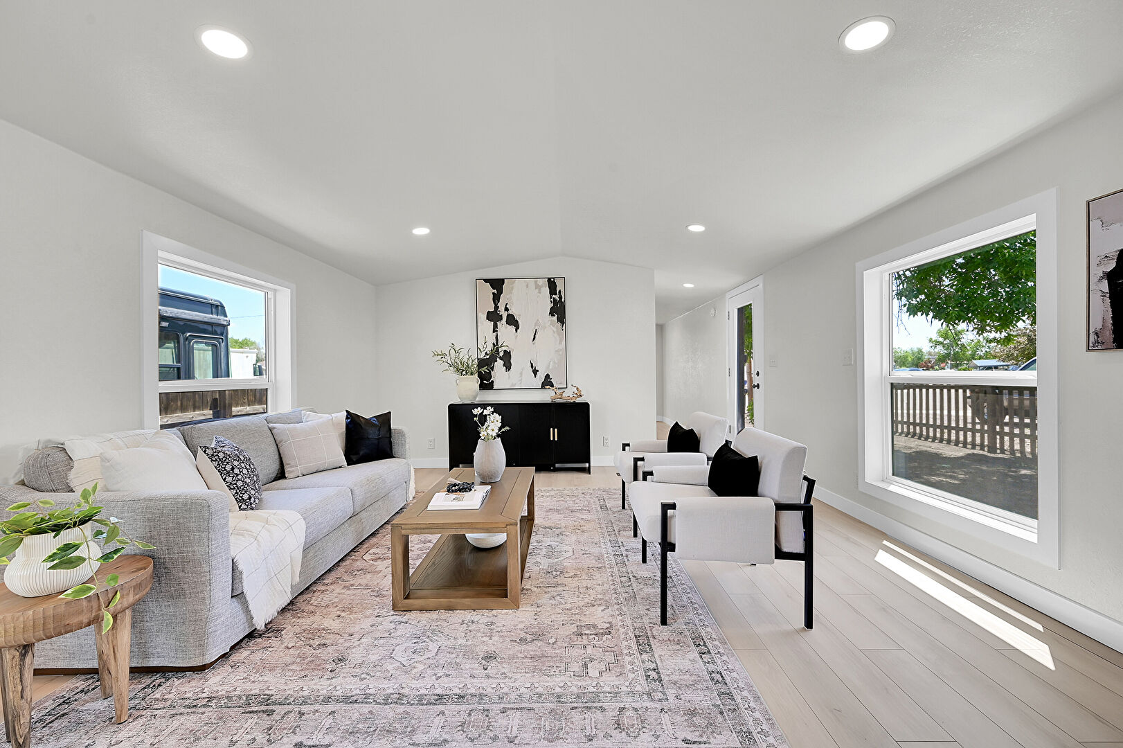 Barn Door, Baseboards Wall, Drywall, Fireplace, Natural Light, Recessed Lighting, Vaulted Ceiling, Vent, Wood Finish Floor, Baseboards Wall, Drywall, Natural Light, Vaulted Ceiling, Wood Finish Floor