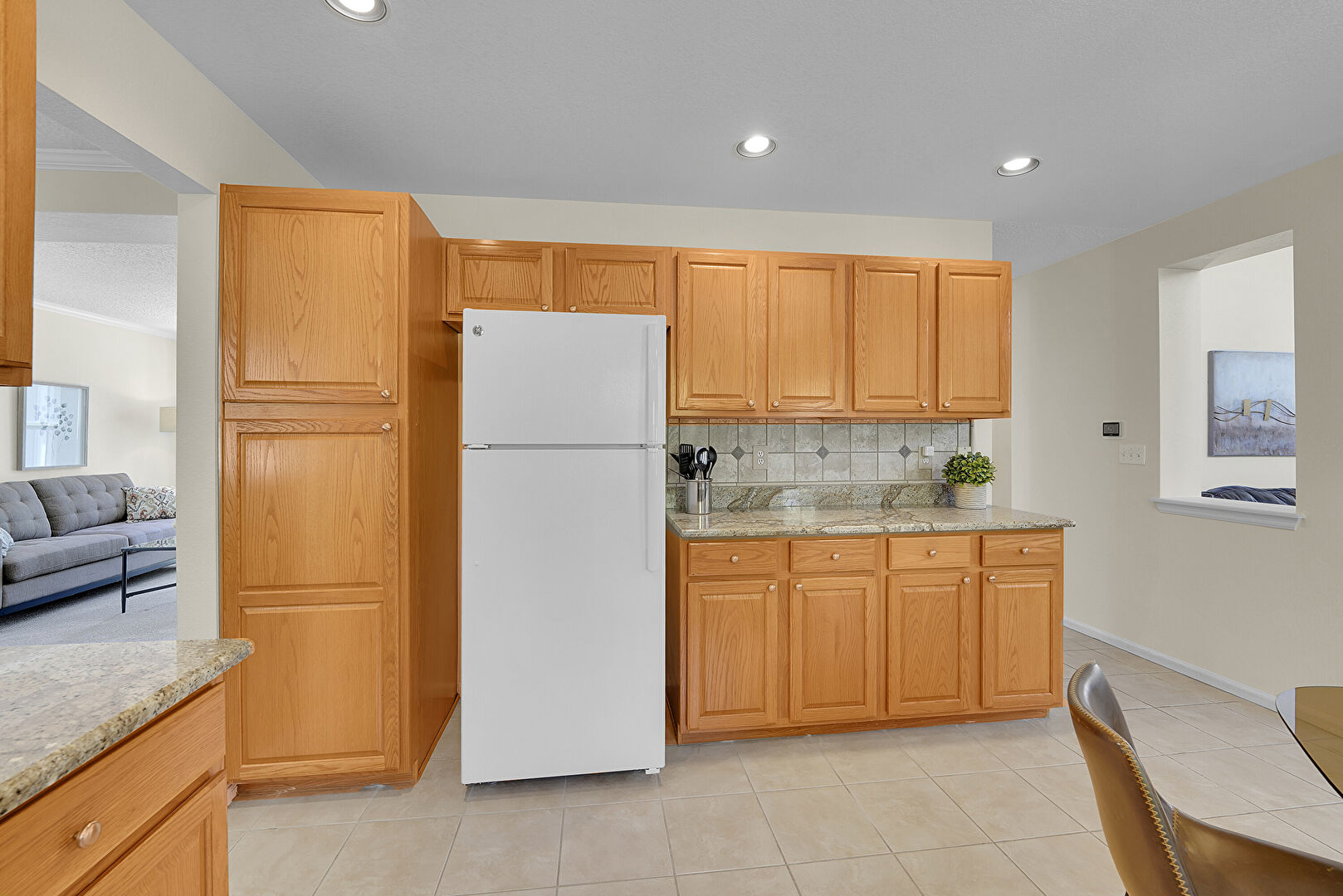 Baseboards Wall, Drywall, Fireplace, Medium Brown Cabinets, Natural Light, Opens To Living Area, Raised Cabinets, Recessed Lighting, Stone Countertops, Textured Ceiling, Tile Floor, U Shaped Kitchen, Drywall, Raised Cabinets, Recessed Lighting, Tile Floor