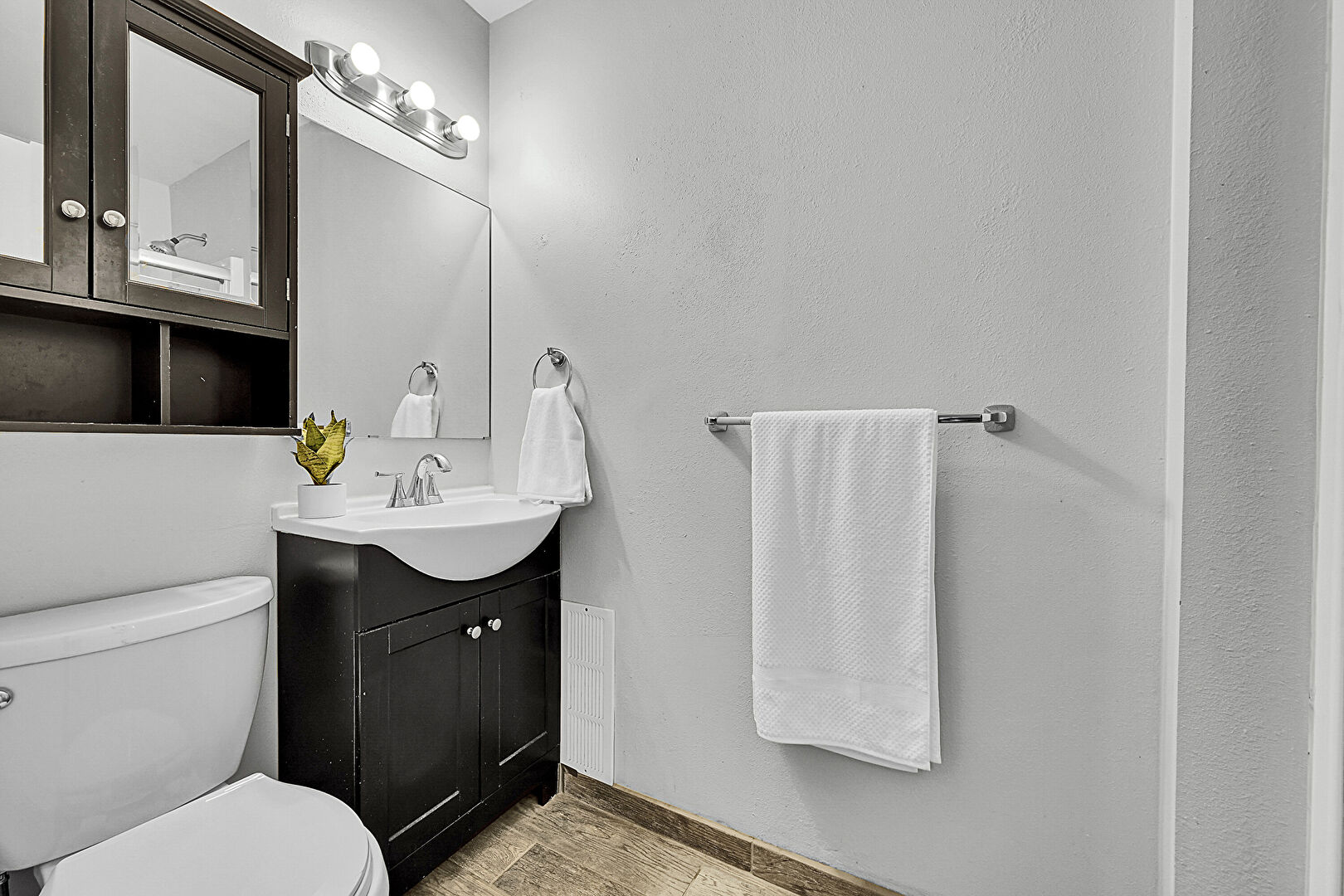 Baseboards Wall, Combined Bath Shower, Drywall, Full Bathroom, Vanity, Vent, Wood Finish Floor, Drywall, Full Bathroom, Notable Chandelier