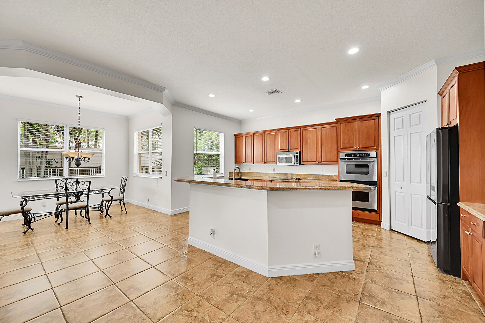 Arched Walkways, Baseboards Wall, Ceiling Fan, Crown Molding, Crown Molding Cabinets, Double Oven, Drywall, Kitchen Bar, Kitchen Island, L Shaped Kitchen, Medium Brown Cabinets, Natural Light, Notable Chandelier, Office Area, Opens To Living Area, Pendant Lighting, Raised Cabinets, Recessed Lighting, Stone Countertops, Tile Floor, Vent, Baseboards Wall, Built In Desk, Double Oven, Drywall, Natural Light, Vent