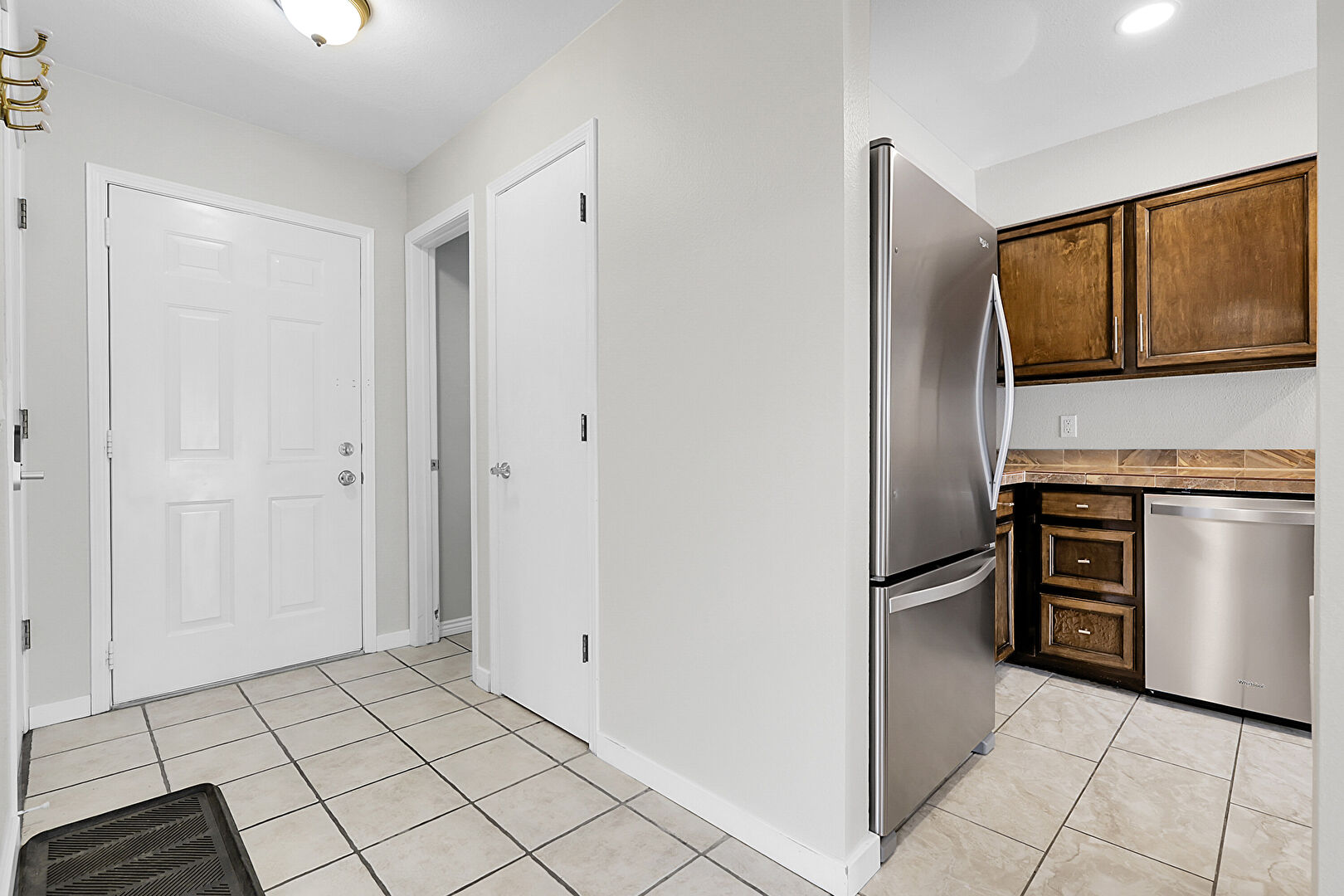 Baseboards Wall, Ceiling Fan, Dark Brown Cabinets, Drywall, Fireplace, Natural Light, Recessed Lighting, Shaker Cabinets, Tile Floor, Vent, Visible Hinge Cabinets, Wood Finish Floor, Baseboards Wall, Opens To Living Area, Shaker Cabinets, Visible Hinge Cabinets, Wood Finish Floor