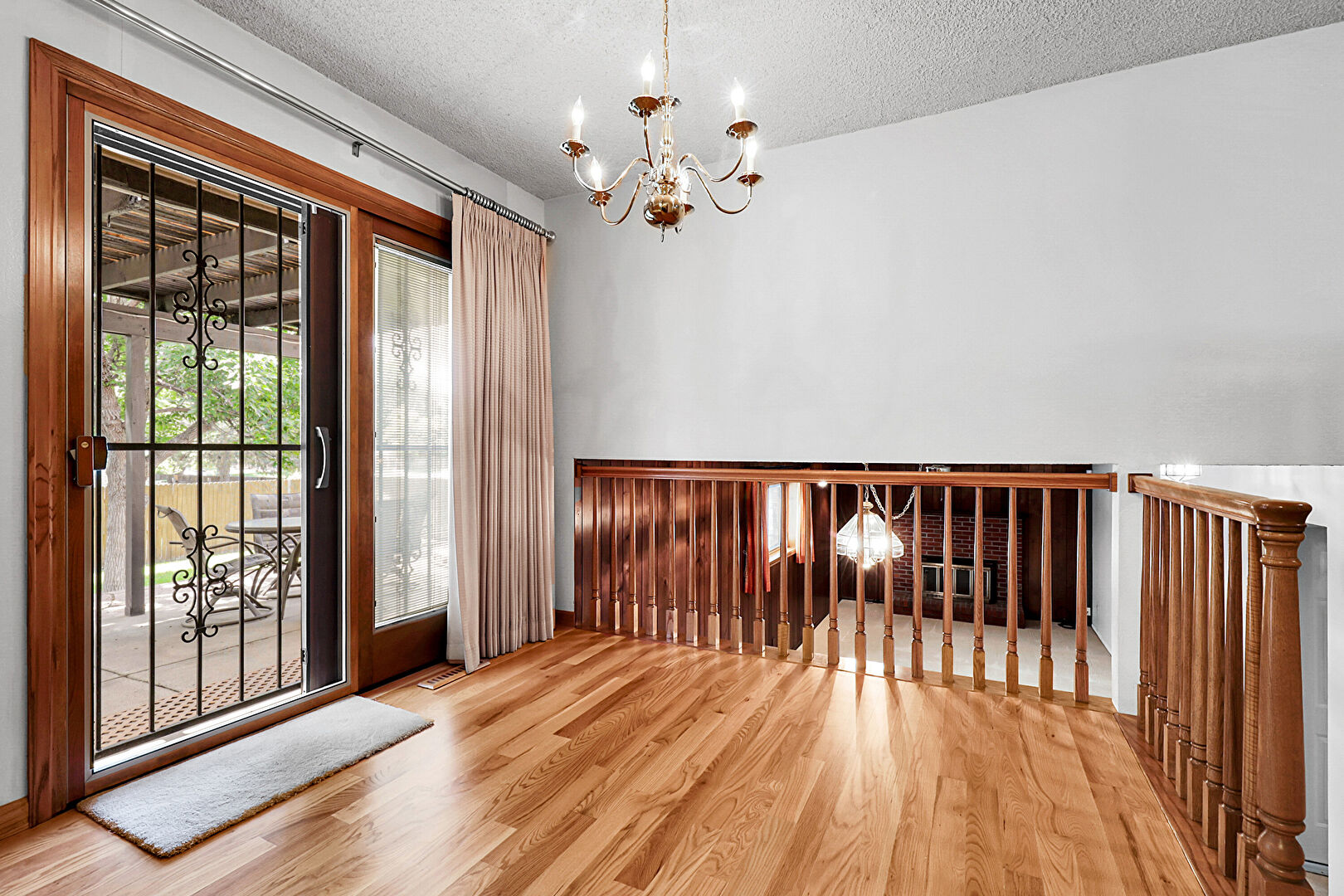 Baseboards Wall, Drywall, Kitchen Peninsula, Medium Brown Cabinets, Natural Light, Notable Chandelier, Recessed Lighting, Textured Ceiling, Upstairs Landing, Vent, Wood Finish Floor, Baseboards Wall, Textured Ceiling