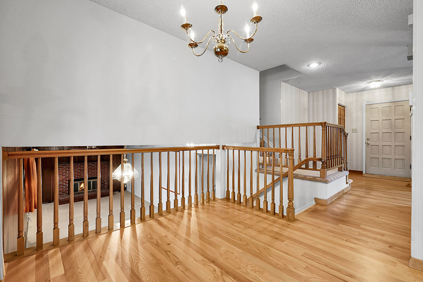 Baseboards Wall, Drywall, Natural Light, Notable Chandelier, Recessed Lighting, Textured Ceiling, Vent, Wood Finish Floor, Stairs