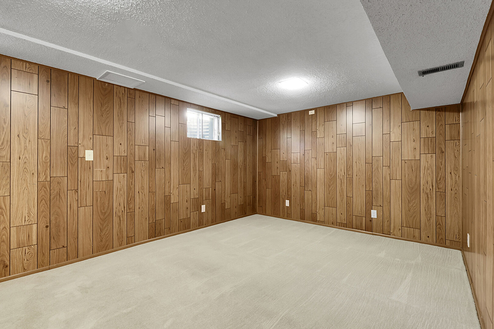Basement, Carpet, Drywall, Natural Light, Stairs, Textured Ceiling, Vent, Wood Wall, Baseboards Wall, Textured Ceiling, Wood Wall