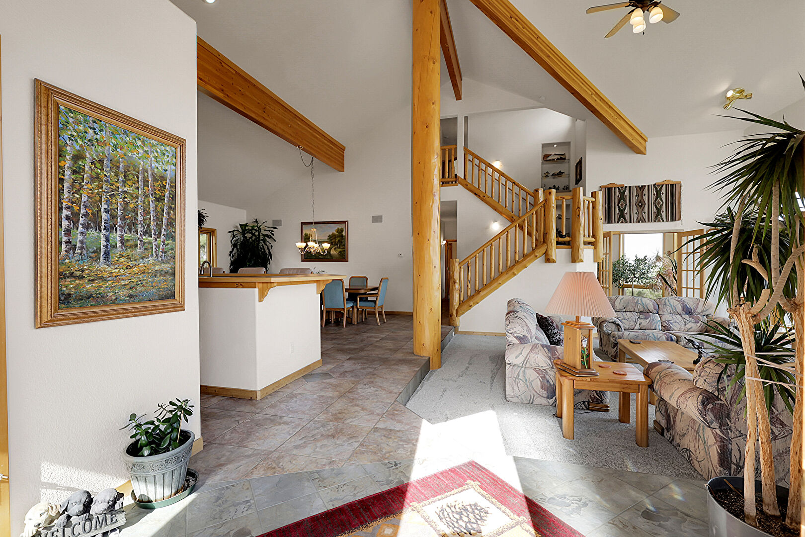 Baseboards Wall, Beamed Ceiling, Cathedral Ceiling, Drywall, High Ceiling, Natural Light, Notable Chandelier, Recessed Lighting, Tile Floor, Vaulted Ceiling, Vent, Beamed Ceiling, Smoke Carbon Monoxide Detector, Stairs