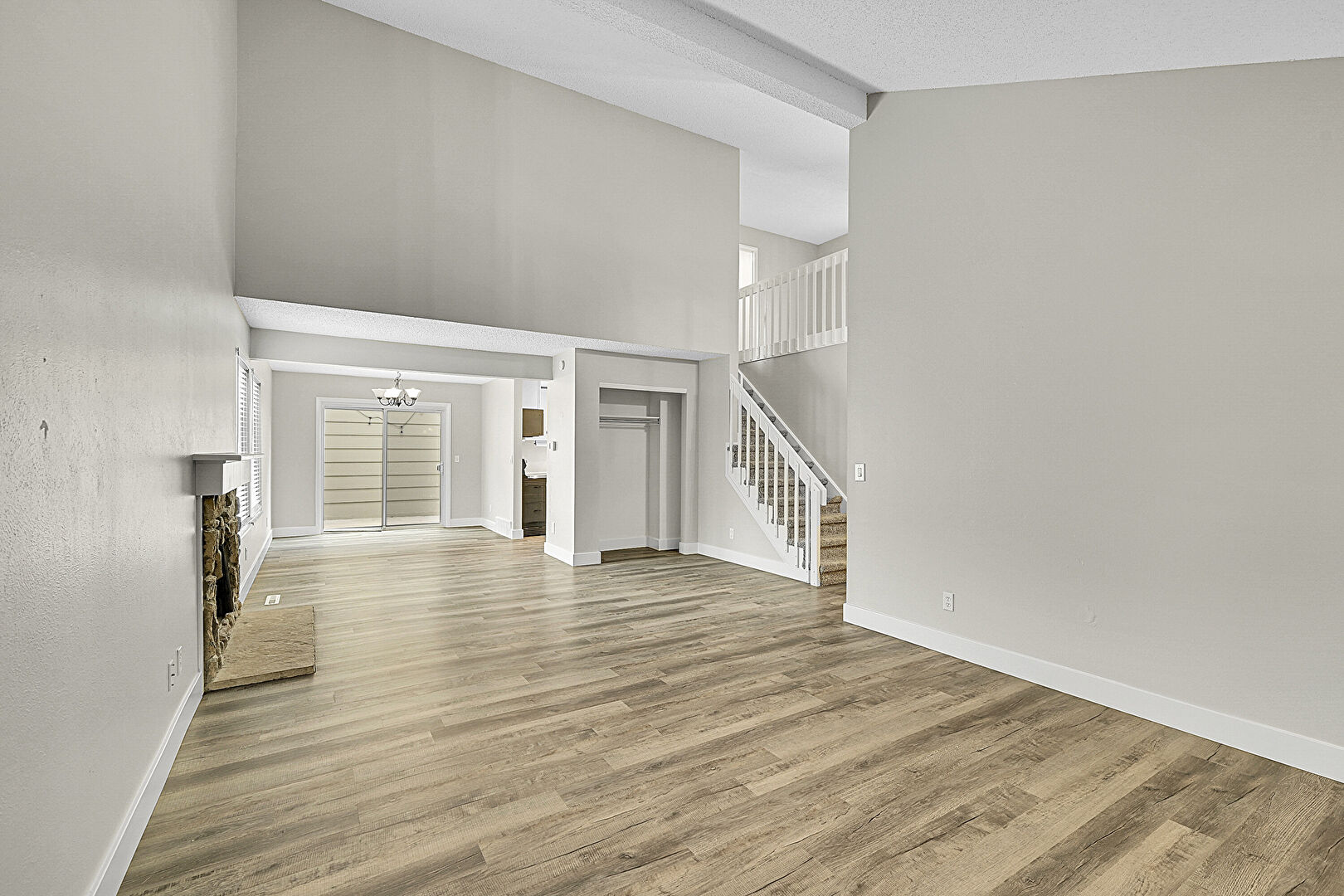 Baseboards Wall, Drywall, Fireplace, Natural Light, Textured Ceiling, Vaulted Ceiling, Vent, Wood Finish Floor, Beamed Ceiling