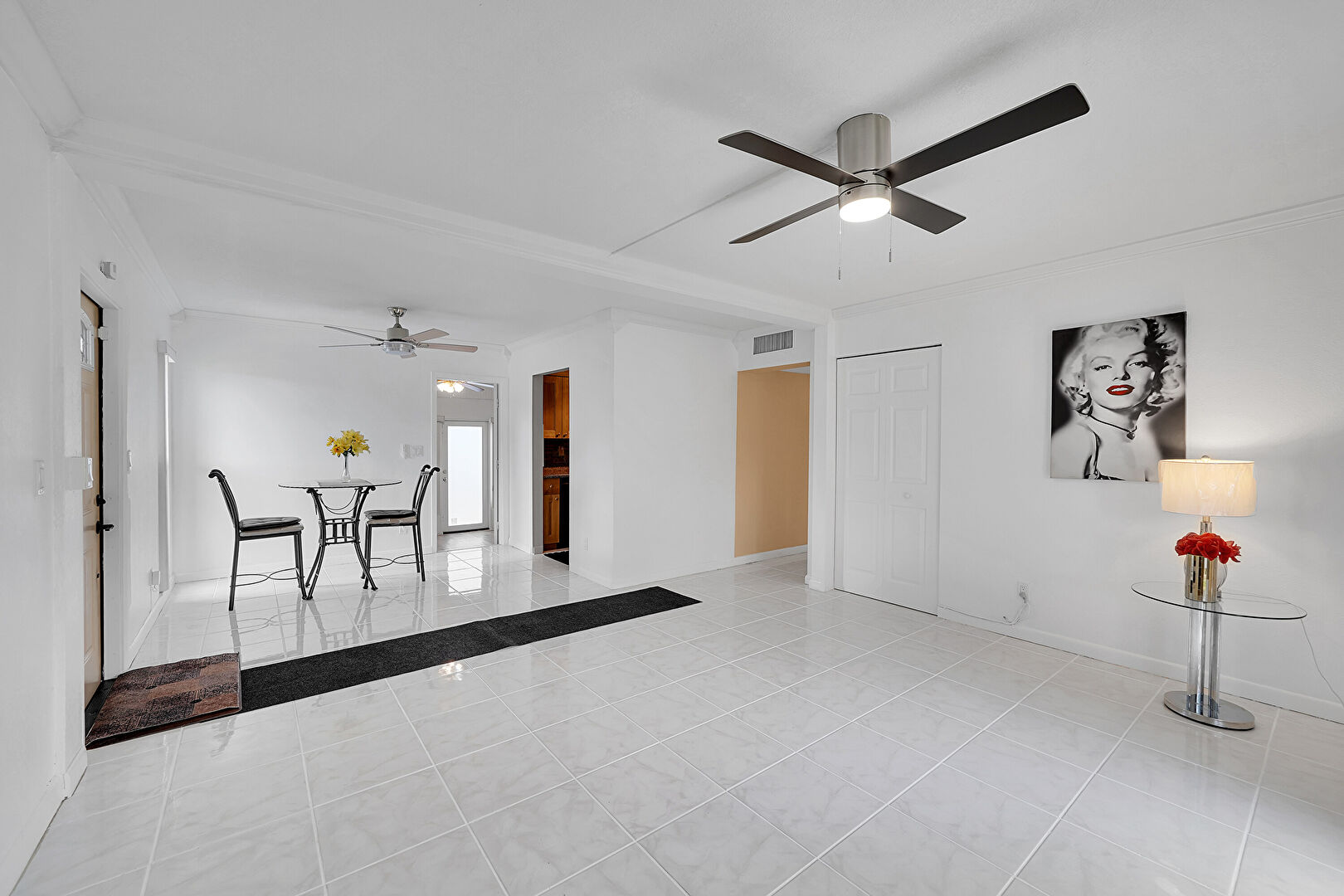 Baseboards Wall, Ceiling Fan, Crown Molding, Drywall, Natural Light, Tile Floor, Crown Molding, Tile Floor