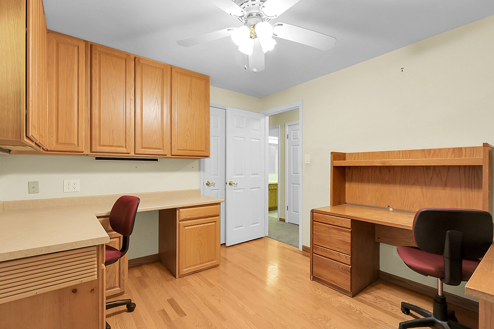 Baseboards Wall, Built In Desk, Ceiling Fan, Drywall, Natural Light, Office Area, Vent, Wood Finish Floor, Baseboards Wall, Office Area