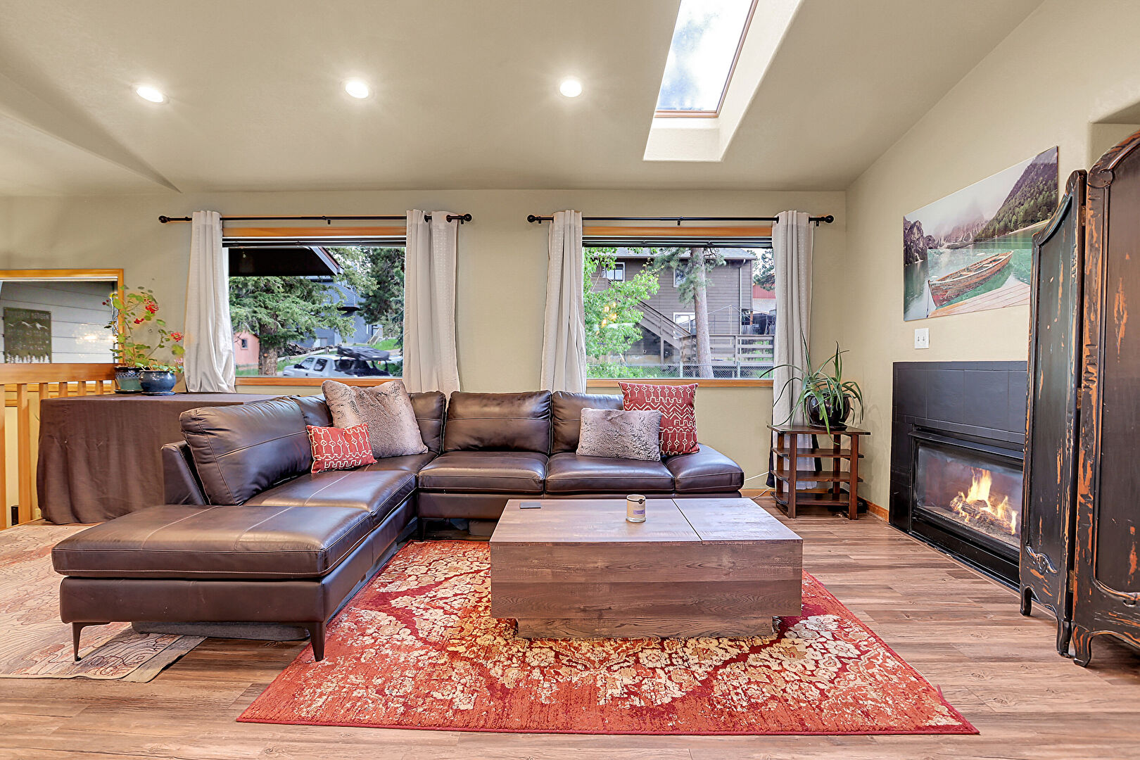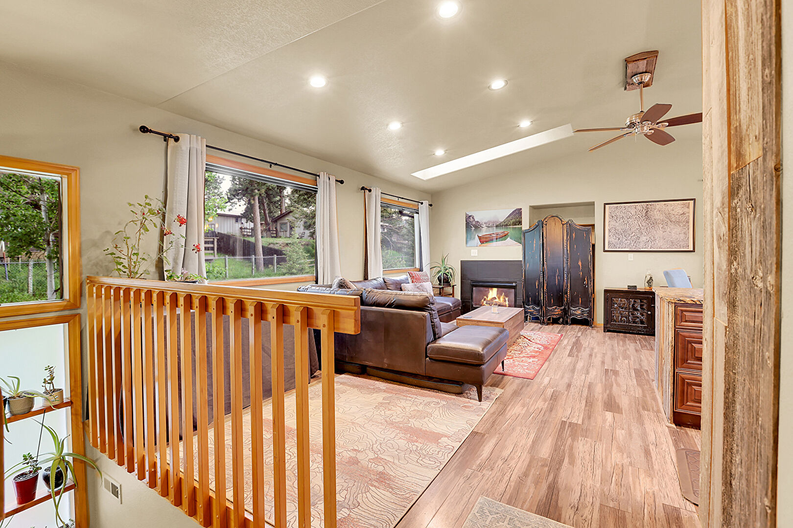 Baseboards Wall, Carpet, Ceiling Fan, Drywall, Fireplace, Natural Light, Notable Chandelier, Recessed Lighting, Skylight, Vaulted Ceiling, Wood Finish Floor, Wood Stove, Baseboards Wall, Carpet, Ceiling Fan, Drywall, Natural Light, Vaulted Ceiling, Vent