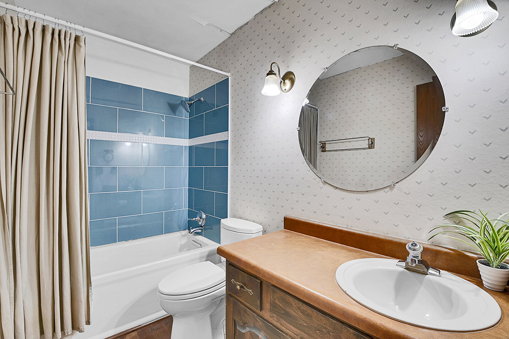Combined Bath Shower, Drywall, Full Bathroom, Textured Ceiling, Vanity, Walk In Closet, Wallpaper Wall, Baseboards Wall, Drywall, Wood Finish Floor