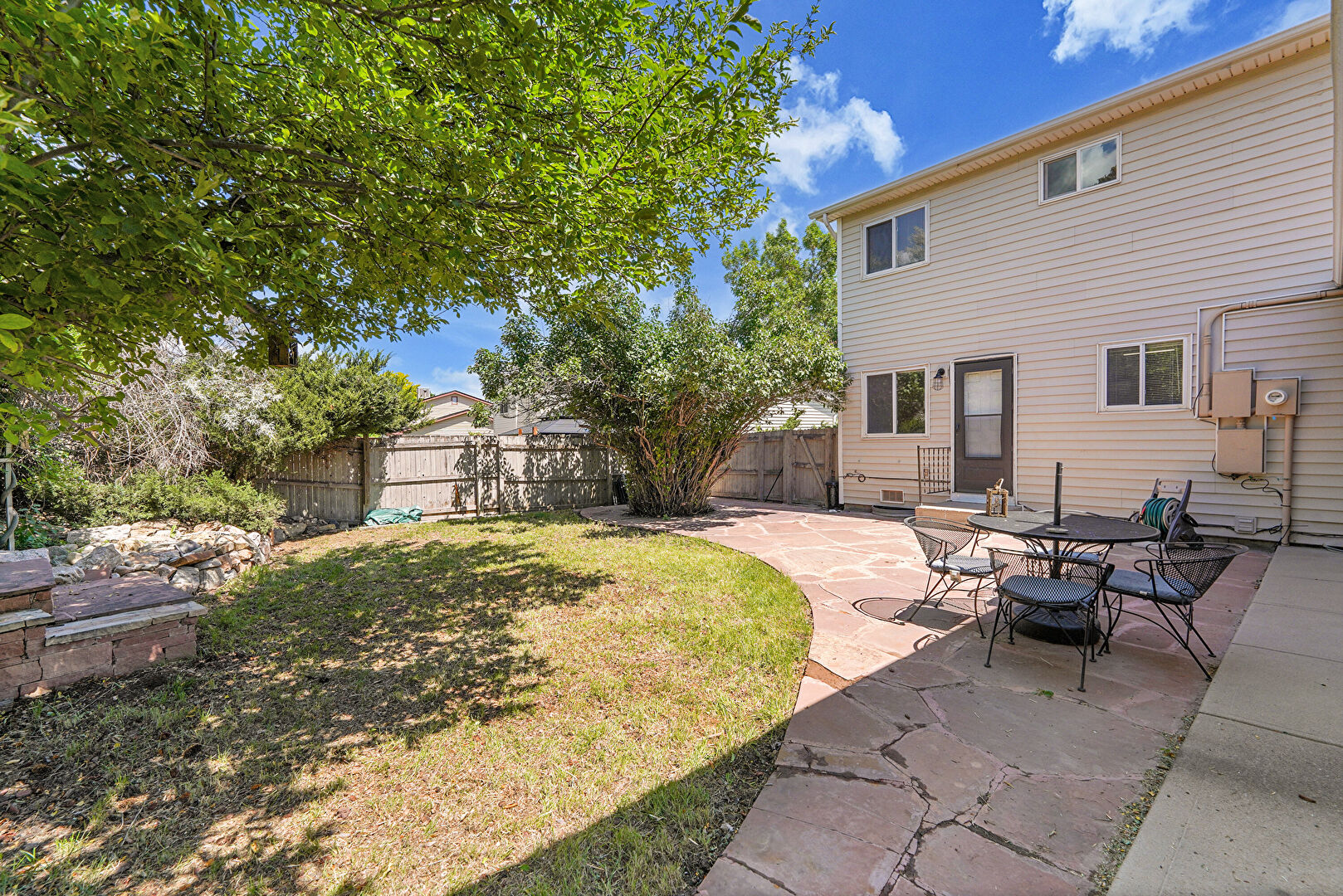 Concrete Foundation, Downspout, Electric Meter, Entry Steps, Fence, Gutters, Horizontal Siding, Lawn, Patio, Fence, Gate, Horizontal Siding, Patio