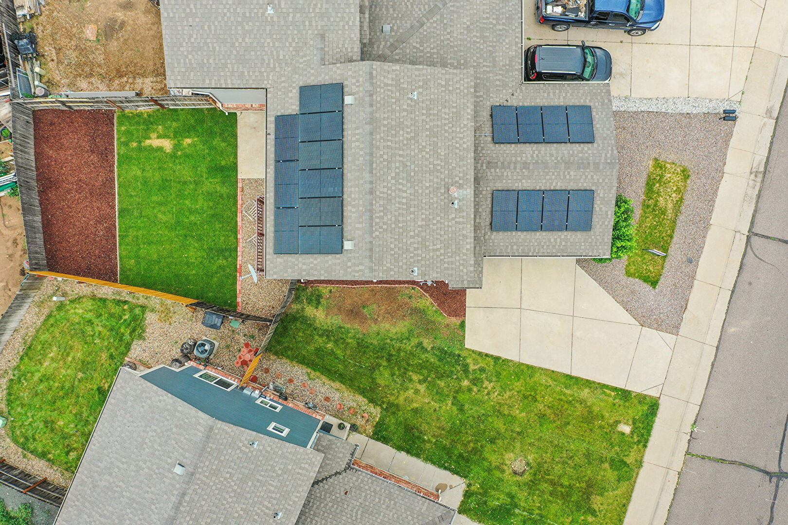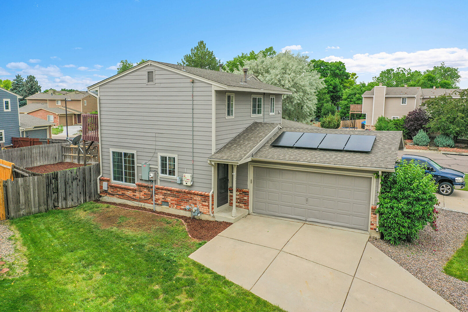 Brick Siding, Central Ac, Concrete Foundation, Deck, Downspout, Driveway, Electric Meter, Fence, French Doors, Gas Meter, Gate, Gutters, Horizontal Siding, Lawn, Patio, Residential View, Satellite Dish, Shingle Roof, Solar Panels, Fence, Gutters, Lawn, Residential View, Solar Panels
