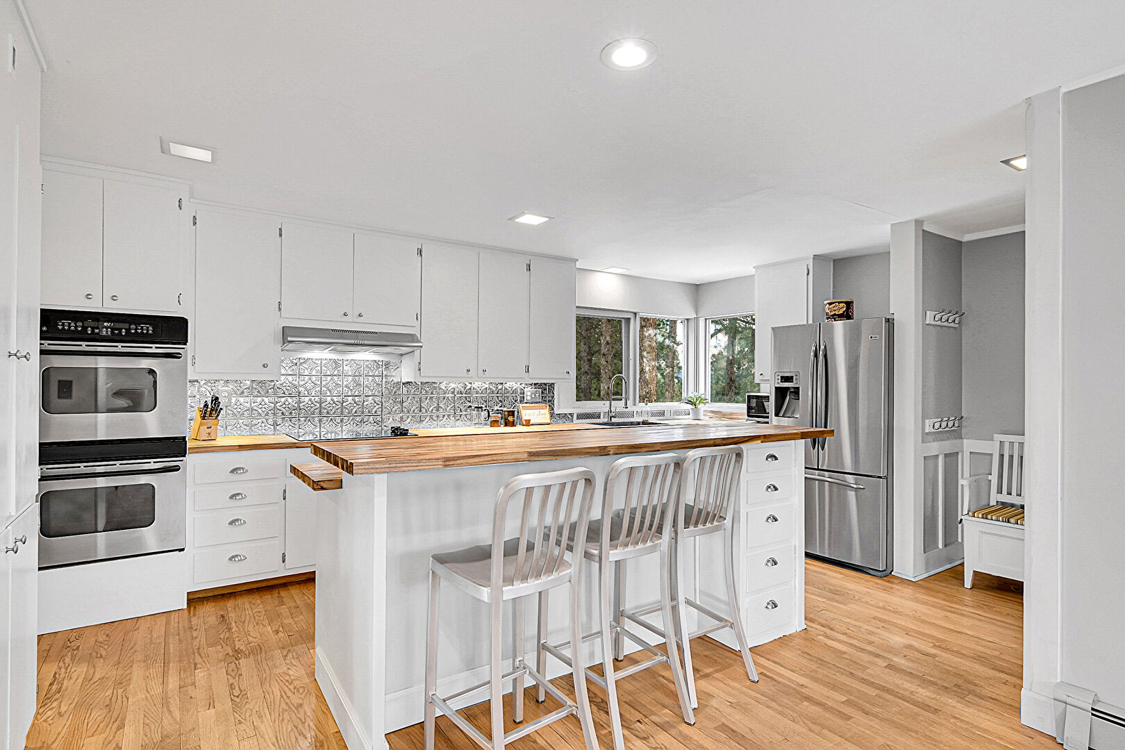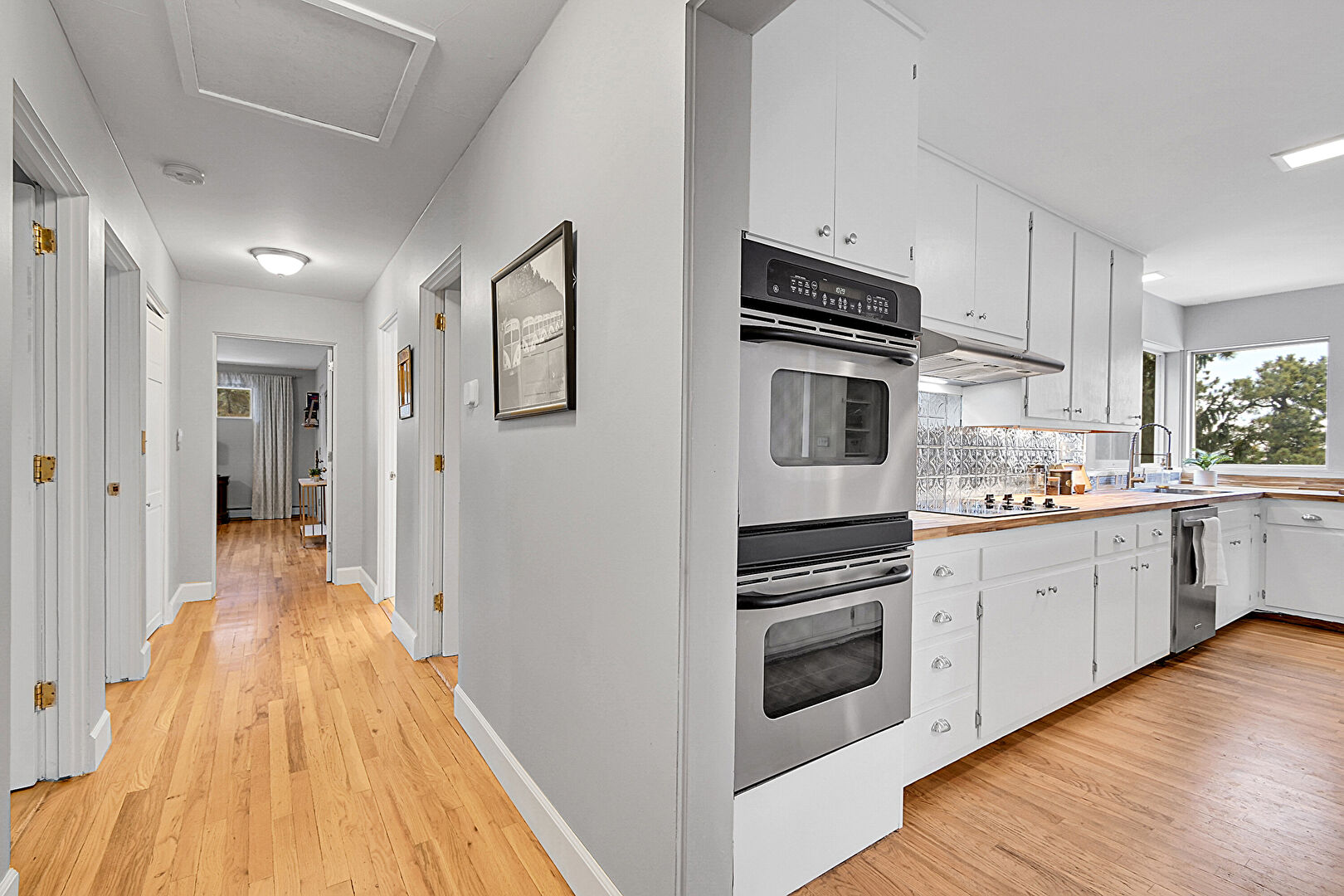 Baseboards Wall, Double Oven, Drywall, Natural Light, Smoke Carbon Monoxide Detector, Visible Hinge Cabinets, Wood Finish Floor, Butcher Block Countertops