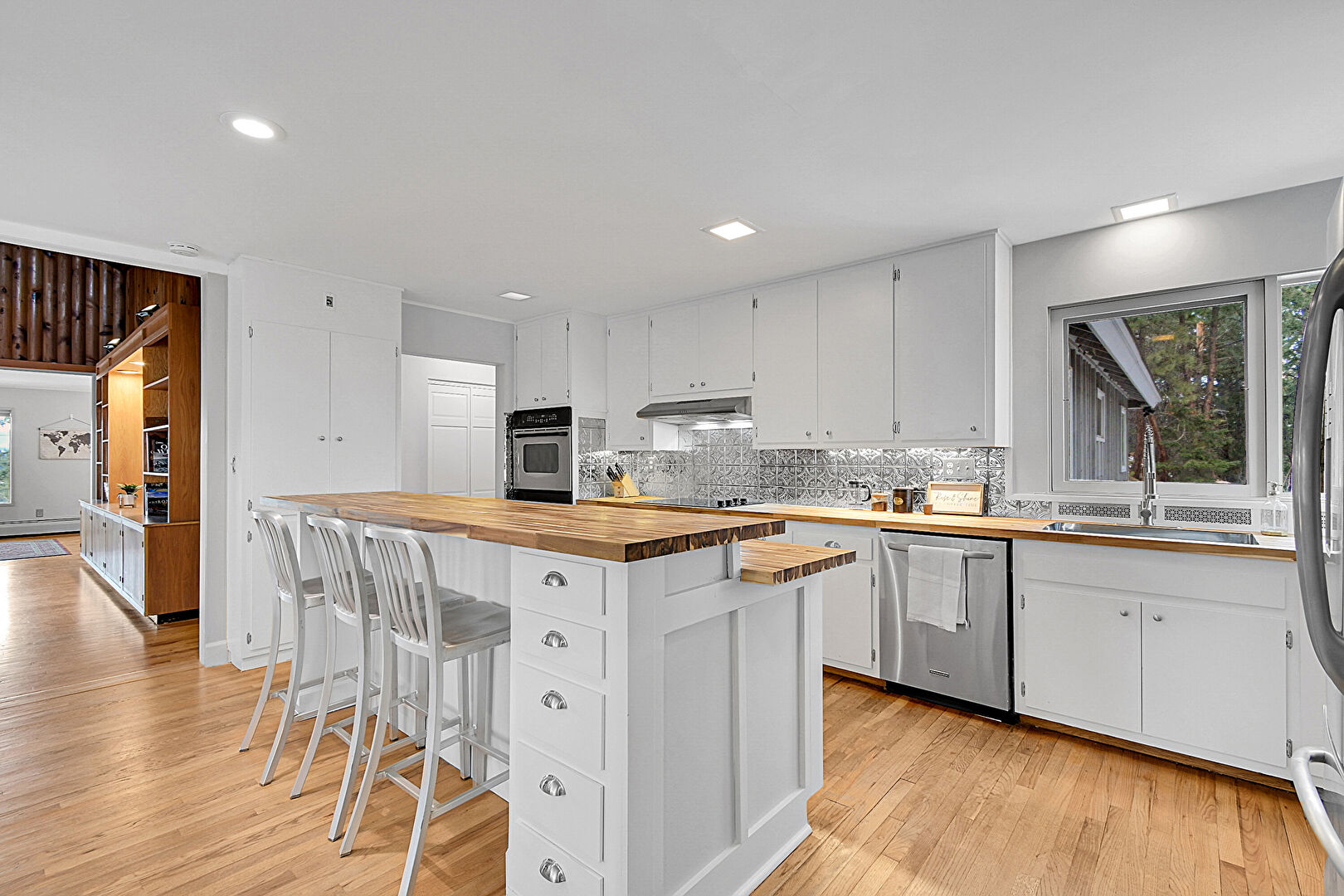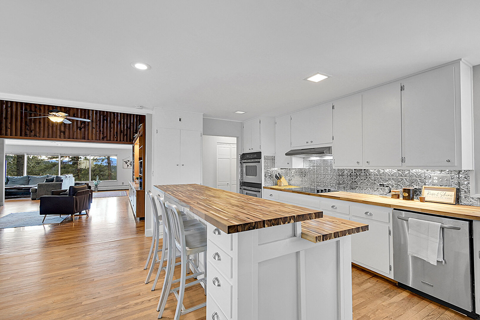 Baseboard Radiator, Baseboards Wall, Butcher Block Countertops, Carpet, Ceiling Fan, Cream Cabinets, Crown Molding, Double Oven, Drywall, Glass Insert Cabinets, Kitchen Bar, Kitchen Island, L Shaped Kitchen, Natural Light, Opens To Living Area, Recessed Lighting, Vent, Visible Hinge Cabinets, Wallpaper Wall, Wood Ceiling, Wood Finish Floor, Ceiling Fan, Kitchen Island, Stainless Steel Countertops, Visible Hinge Cabinets