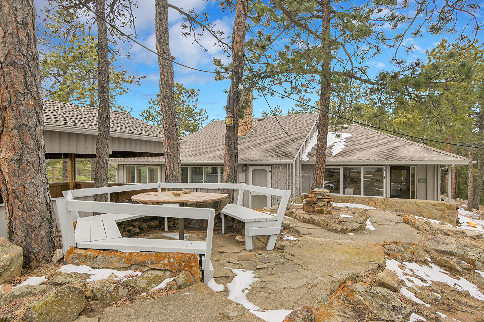 Board Batten Siding, Chimney, Deck, Downspout, Driveway, Fence, Forest View, Gutters, Mountain View, Parking Lot, Shingle Roof, Stairs, Stone Siding, Stoop, Vertical Siding, Board Batten Siding, Forest View, Mountain View, Stoop, Vertical Siding